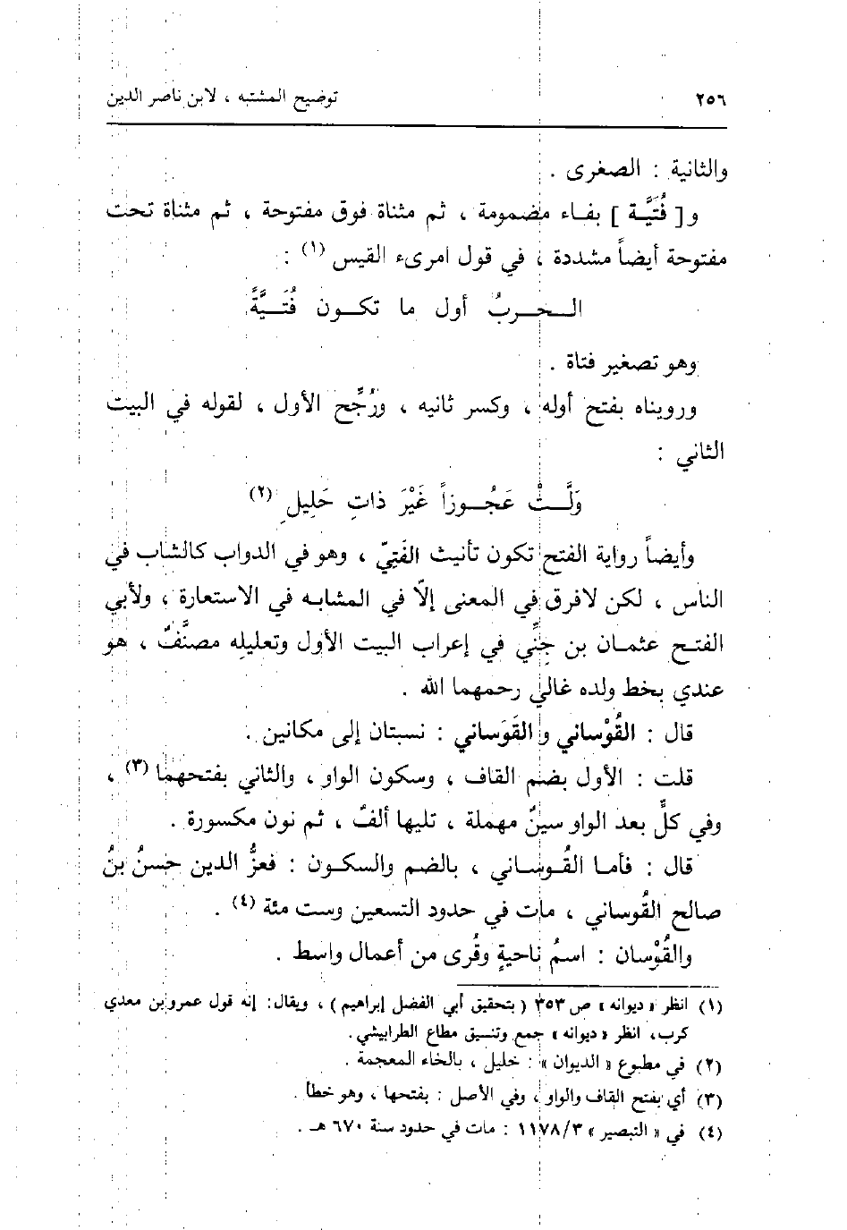 وَأَيْضًا رِوَايَة الْفَتْح تكون تَأْنِيث الفتي وَهُوَ فِي الدَّوَابّ كالشاب فِي النَّاس لَكِن لَا فرق فِي الْمَعْنى إِلَّا فِي المشابه فِي الِاسْتِعَارَة وَلأبي الْفَتْح عُثْمَان بن جني فِي إِعْرَاب الْبَيْت الأول وتعليله مُصَنف هُوَ عِنْدِي بِخَط وَلَده غالي رحمهمَا الله. قَالَ: القوساني والقوساني: نسبتان إِلَى مكانين. قلت: الأول بِضَم الْقَاف وَسُكُون الْوَاو وَالثَّانِي بفتحهما وَفِي كل بعد الْوَاو سين مُهْملَة تَلِيهَا ألف ثمَّ نون مَكْسُورَة. قَالَ: فَأَما القوساني بِالضَّمِّ والسكون: فعز الدّين حسن بن صَالح القوساني مَاتَ فِي حُدُود التسعين وست مئة. والقوسان: اسْم نَاحيَة وقرى من أَعمال وَاسِط.