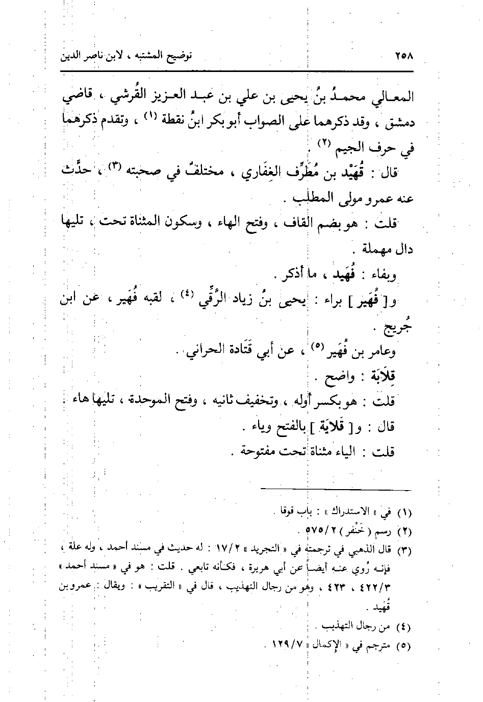 الْمَعَالِي مُحَمَّد بن يحيى بن عَليّ بن عبد الْعَزِيز الْقرشِي قَاضِي دمشق وَقد ذكرهمَا على الصَّوَاب أَبُو بكر ابْن نقطة وَتقدم ذكرهمَا فِي حرف الْجِيم. قَالَ: قهيد بن مطرف الْغِفَارِيّ مُخْتَلف فِي صحبته حدث عَنهُ عَمْرو مولى الْمطلب. قلت: هُوَ بِضَم الْقَاف وَفتح الْهَاء وَسُكُون الْمُثَنَّاة تَحت تَلِيهَا دَال مُهْملَة. وبفاء: فهيد مَا أذكر. و [فهير] برَاء: يحيى بن زِيَاد الرقي لقبه فهير عَن ابْن جريج. وعامر بن فهير عَن أبي قَتَادَة الْحَرَّانِي. قلَابَة: وَاضح. قلت: هُوَ بِكَسْر أَوله وَتَخْفِيف ثَانِيه وَفتح الْمُوَحدَة تَلِيهَا هَاء. قَالَ: و [قلاية] بِالْفَتْح وياء. قلت: الْيَاء مثناة تَحت مَفْتُوحَة.