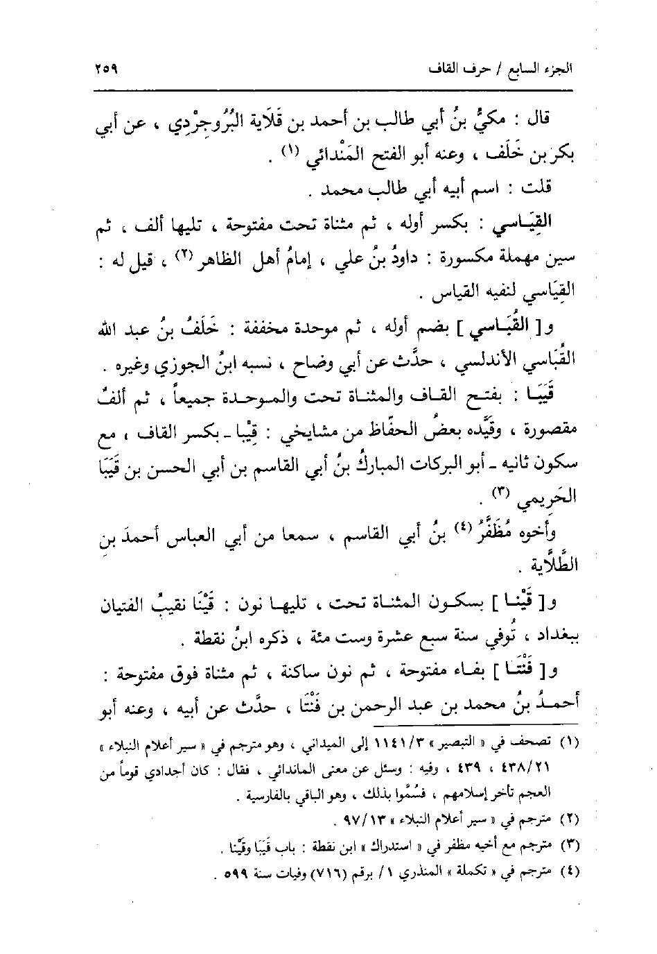 قَالَ: مكي بن أبي طَالب بن أَحْمد بن قلاية البروجردي عَن أبي بكر بن خلف وَعنهُ أَبُو الْفَتْح المندائي. قلت: اسْم أَبِيه أبي طَالب مُحَمَّد. القياسي: بِكَسْر أَوله ثمَّ مثناة تَحت مَفْتُوحَة تَلِيهَا ألف ثمَّ سين مُهْملَة مَكْسُورَة: دَاوُد بن عَليّ إِمَام أهل الظَّاهِر قيل لَهُ: القياسي لنفيه الْقيَاس. و [القباسي] بِضَم أَوله ثمَّ مُوَحدَة مُخَفّفَة: خلف بن عبد الله القباسي الأندلسي حدث عَن أبي وضاح نسبه ابْن الْجَوْزِيّ وَغَيره. قيبا: بِفَتْح الْقَاف والمثناة تَحت وَالْمُوَحَّدَة جَمِيعًا ثمَّ ألف مَقْصُورَة وقديه بعض الْحفاظ من مشايخي: قيبا _ بِكَسْر الْقَاف مَعَ سُكُون ثَانِيه _ أَبُو البركات الْمُبَارك بن أبي الْقَاسِم بن أبي الْحسن بن قيبا الحريمي. وَأَخُوهُ مظفر بن أبي الْقَاسِم سمعا من أبي الْعَبَّاس أَحْمد بن الطلاية. و [قينا] بِسُكُون الْمُثَنَّاة تَحت تَلِيهَا نون: قينا نقيب الفتيان بِبَغْدَاد توفّي سنة سبع عشرَة وست مئة ذكره ابْن نقطة. و [فنتا] بفاء مَفْتُوحَة ثمَّ نون سَاكِنة ثمَّ مثناة فَوق مَفْتُوحَة: أَحْمد بن مُحَمَّد بن عبد الرَّحْمَن بن فنتا حدث عَن أَبِيه وَعنهُ أَبُو