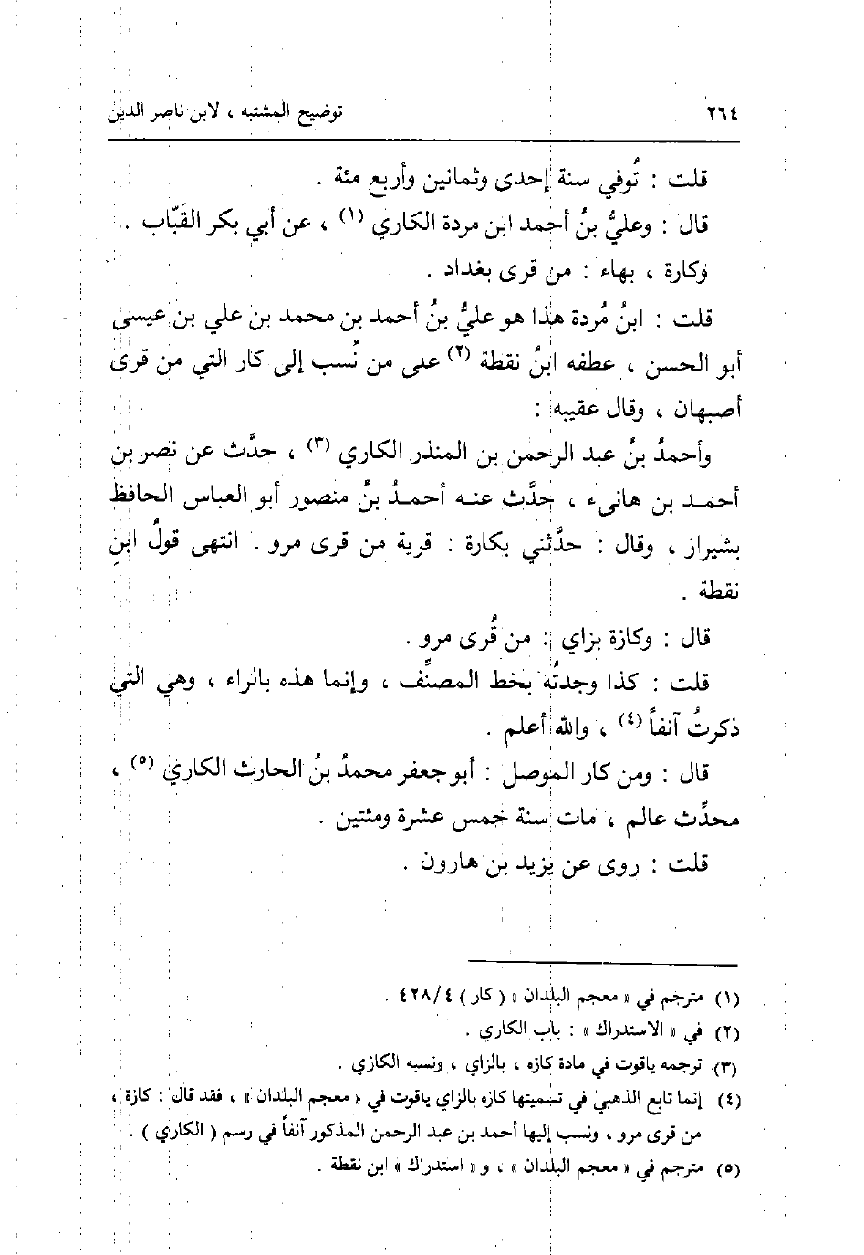 قلت: توفّي سنة إِحْدَى وَثَمَانِينَ وَأَرْبع مئة. قَالَ: وَعلي بن أَحْمد ابْن مَرَدَة الكاري عَن أبي بكر القباب. وكارة بهاء: من قرى بَغْدَاد. قلت: ابْن مَرَدَة هَذَا هُوَ عَليّ بن أَحْمد بن مُحَمَّد بن عَليّ بن عِيسَى أَبُو الْحسن عطفه ابْن نقطة على من نسب إِلَى كار الَّتِي من قرى أَصْبَهَان وَقَالَ عَقِيبه: وَأحمد بن عبد الرَّحْمَن بن الْمُنْذر الكاري حدث عَن نصر بن أَحْمد بن هَانِئ حدث عَنهُ أَحْمد بن مَنْصُور أَبُو الْعَبَّاس الْحَافِظ بشيراز وَقَالَ: حَدثنِي بكارة: قَرْيَة من قرى مرو. انْتهى قَول ابْن نقطة. قَالَ: وكازة بزاي: من قرى مرو. قلت: كَذَا وجدته بِخَط المُصَنّف وَإِنَّمَا هَذِه بالراء وَهِي الَّتِي ذكرت آنِفا وَالله أعلم. قَالَ: وَمن كار الْموصل: أَبُو جَعْفَر مُحَمَّد بن الْحَارِث الكاري مُحدث عَالم مَاتَ سنة خمس عشرَة ومئتين. قلت: روى عَن يزِيد بن هَارُون.