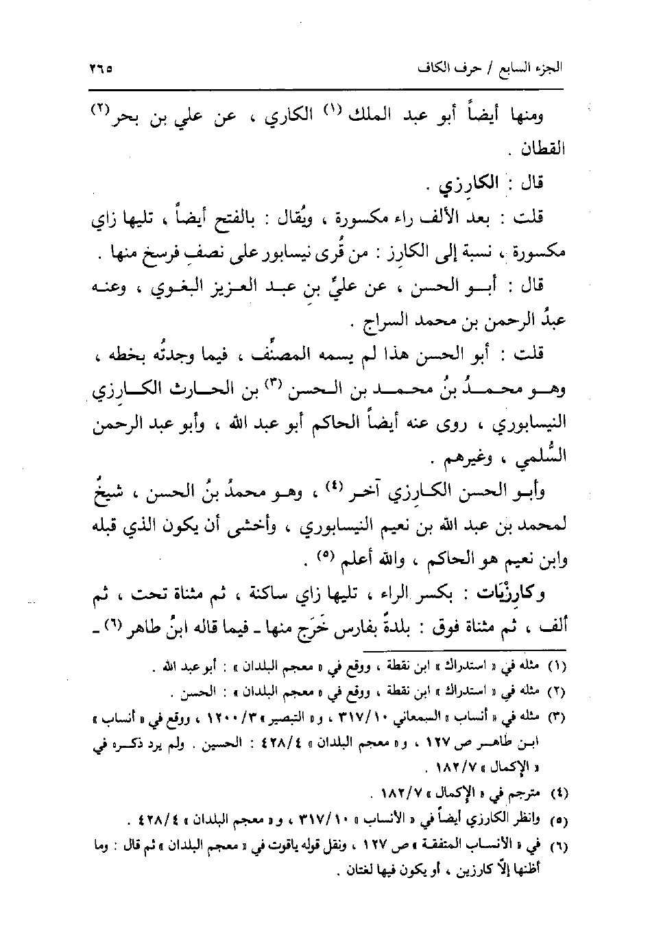 وَمِنْهَا أَيْضا أَبُو عبد الْملك الكاري عَن عَليّ بن بَحر الْقطَّان. قَالَ: الكارزي. قلت: بعد الْألف رَاء مَكْسُورَة وَيُقَال: بِالْفَتْح أَيْضا تَلِيهَا زَاي مَكْسُورَة نِسْبَة إِلَى الكارز: من قرى نيسابور على نصف فَرسَخ مِنْهَا. قَالَ: أَبُو الْحسن عَن عَليّ بن عبد الْعَزِيز الْبَغَوِيّ وَعنهُ عبد الرَّحْمَن بن مُحَمَّد السراج. قلت: أَبُو الْحسن هَذَا لم يسمه المُصَنّف فِيمَا وجدته بِخَطِّهِ وَهُوَ مُحَمَّد بن مُحَمَّد بن الْحسن بن الْحَارِث الكارزي النَّيْسَابُورِي روى عَنهُ أَيْضا الْحَاكِم أَبُو عبد الله وَأَبُو عبد الرَّحْمَن السّلمِيّ وَغَيرهم. وَأَبُو الْحسن الكارزي آخر وَهُوَ مُحَمَّد بن الْحسن شيخ لمُحَمد بن عبد الله بن نعيم النَّيْسَابُورِي وأخشى أَن يكون الَّذِي قبله وَابْن نعيم هُوَ الْحَاكِم وَالله أعلم. وكارزيات: بِكَسْر الرَّاء تَلِيهَا زَاي سَاكِنة ثمَّ مثناة تَحت ثمَّ ألف ثمَّ مثناة فَوق: بَلْدَة بِفَارِس خرج مِنْهَا _ فِيمَا قَالَه ابْن طَاهِر _