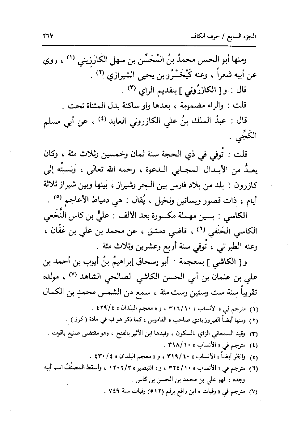 وَمِنْهَا أَبُو الْحسن مُحَمَّد بن المحسن بن سهل الكارزيني روى عَن أَبِيه شعرًا وَعنهُ كيخسرو بن يحيى الشِّيرَازِيّ. قَالَ: و [الكازروني] بِتَقْدِيم الزَّاي. قلت: وَالرَّاء مَضْمُومَة بعْدهَا وَاو سَاكِنة بدل الْمُثَنَّاة تَحت. قَالَ: عبد الْملك بن عَليّ الكازروني العابد عَن أبي مُسلم الْكَجِّي. قلت: توفّي فِي ذِي الْحجَّة سنة ثَمَان وَخمسين وَثَلَاث مئة وَكَانَ يعد من الأبدال المجابي الدعْوَة رَحمَه الله تَعَالَى ونسبته إِلَى كازرون: بلد من بِلَاد فَارس بَين الْبَحْر وشيراز بَينهَا وَبَين شيراز ثَلَاثَة أَيَّام ذَات قُصُور وبساتين ونخيل يُقَال: هِيَ دمياط الْأَعَاجِم. الكاسي: بسين مُهْملَة مَكْسُورَة بعد الْألف: عَليّ بن كاس النَّخعِيّ الكاسي الْحَنَفِيّ قَاضِي دمشق عَن مُحَمَّد بن عَليّ بن عَفَّان وَعنهُ الطَّبَرَانِيّ توفّي سنة أَربع وَعشْرين وَثَلَاث مئة. و [الكاشي] بِمُعْجَمَة: أَبُو إِسْحَاق إِبْرَاهِيم بن أَيُّوب بن أَحْمد بن عَليّ بن عُثْمَان بن أبي الْحسن الكاشي الصَّالِحِي الشَّاهِد مولده تَقْرِيبًا سنة سِتّ وَسِتِّينَ وست مئة سمع من الشَّمْس مُحَمَّد بن الْكَمَال