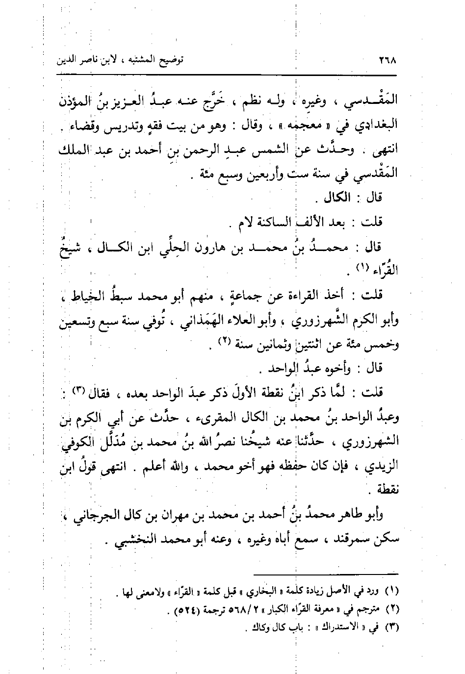 الْمَقْدِسِي وَغَيره وَله نظم خرج عَنهُ عبد الْعَزِيز بن الْمُؤَذّن الْبَغْدَادِيّ فِي مُعْجَمه وَقَالَ: وَهُوَ من بَيت فقه وتدريس وَقَضَاء. انْتهى. وَحدث عَن الشَّمْس عبد الرَّحْمَن بن أَحْمد بن عبد الْملك الْمَقْدِسِي فِي سنة سِتّ وَأَرْبَعين وَسبع مئة. قَالَ: الكال. قلت: بعد الْألف الساكنة لَام. قَالَ: مُحَمَّد بن مُحَمَّد بن هَارُون الْحلِيّ ابْن الكال شيخ الْقُرَّاء. قلت: أَخذ الْقِرَاءَة عَن جمَاعَة مِنْهُم أَبُو مُحَمَّد سبط الْخياط وَأَبُو الْكَرم الشهرزوري وَأَبُو الْعَلَاء الهمذاني توفّي سنة سبع وَتِسْعين وَخمْس مئة عَن اثْنَتَيْنِ وَثَمَانِينَ سنة. قَالَ: وَأَخُوهُ عبد الْوَاحِد. قلت: لما ذكر ابْن نقطة الأول ذكر عبد الْوَاحِد بعده فَقَالَ: وَعبد الْوَاحِد بن مُحَمَّد بن الكال الْمُقْرِئ حدث عَن أبي الْكَرم بن الشهرزوري حَدثنَا عَنهُ شَيخنَا نصر الله بن مُحَمَّد بن مدلل الْكُوفِي الزيدي فَإِن كَانَ حفظه فَهُوَ أَخُو مُحَمَّد وَالله أعلم. انْتهى قَول ابْن نقطة. وَأَبُو طَاهِر مُحَمَّد بن أَحْمد بن مُحَمَّد بن مهْرَان بن كال الْجِرْجَانِيّ سكن سَمَرْقَنْد سمع أَبَاهُ وَغَيره وَعنهُ أَبُو مُحَمَّد النخشبي.