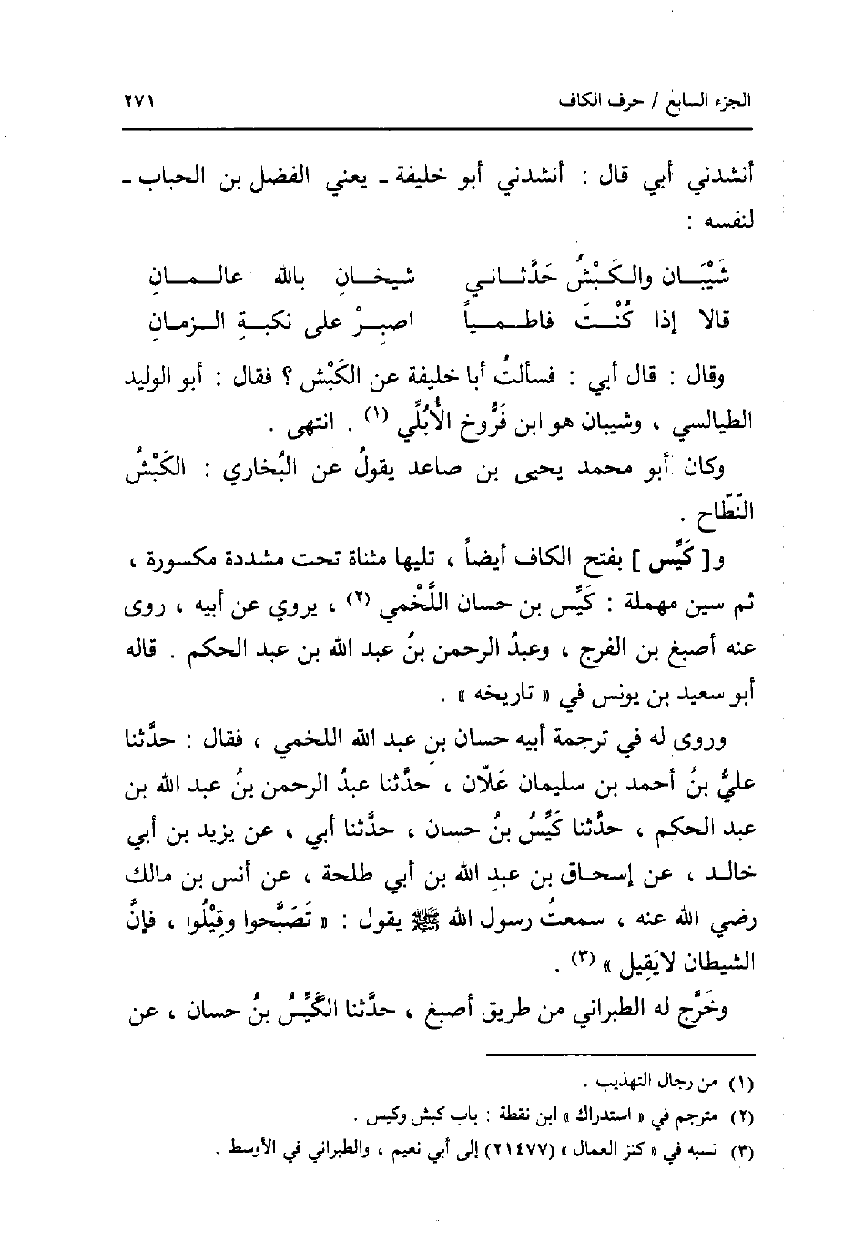 وَقَالَ: قَالَ أبي: فَسَأَلت أَبَا خَليفَة عَن الْكَبْش؟ فَقَالَ: أَبُو الْوَلِيد الطَّيَالِسِيّ وشيبان هُوَ ابْن فروخ الأبلي. انْتهى. وَكَانَ أَبُو مُحَمَّد يحيى بن صاعد يَقُول عَن البُخَارِيّ: الْكَبْش النطاح. و [كيس] بِفَتْح الْكَاف أَيْضا تَلِيهَا مثناة تَحت مُشَدّدَة مَكْسُورَة ثمَّ سين مُهْملَة: كيس بن حسان اللَّخْمِيّ يروي عَن أَبِيه روى عَنهُ أصبغ بن الْفرج وَعبد الرَّحْمَن بن عبد الله بن عبد الحكم. قَالَه أَبُو سعيد بن يُونُس فِي تَارِيخه. وروى لَهُ فِي تَرْجَمَة أَبِيه حسان بن عبد الله اللَّخْمِيّ فَقَالَ: حَدثنَا عَليّ بن أَحْمد بن سُلَيْمَان عَلان حَدثنَا عبد الرَّحْمَن بن عبد الله بن عبد الحكم حَدثنَا كيس بن حسان حَدثنَا أبي عَن يزِيد بن أبي خَالِد عَن إِسْحَاق بن عبد الله بن أبي طَلْحَة عَن أنس بن مَالك رَضِي الله عَنهُ سَمِعت رَسُول الله صلى الله عَلَيْهِ وَسلم يَقُول: تصبحوا وقيلوا فَإِن الشَّيْطَان لَا يقيل. وَخرج لَهُ الطَّبَرَانِيّ من طَرِيق أصبغ حَدثنَا الْكيس بن حسان عَن