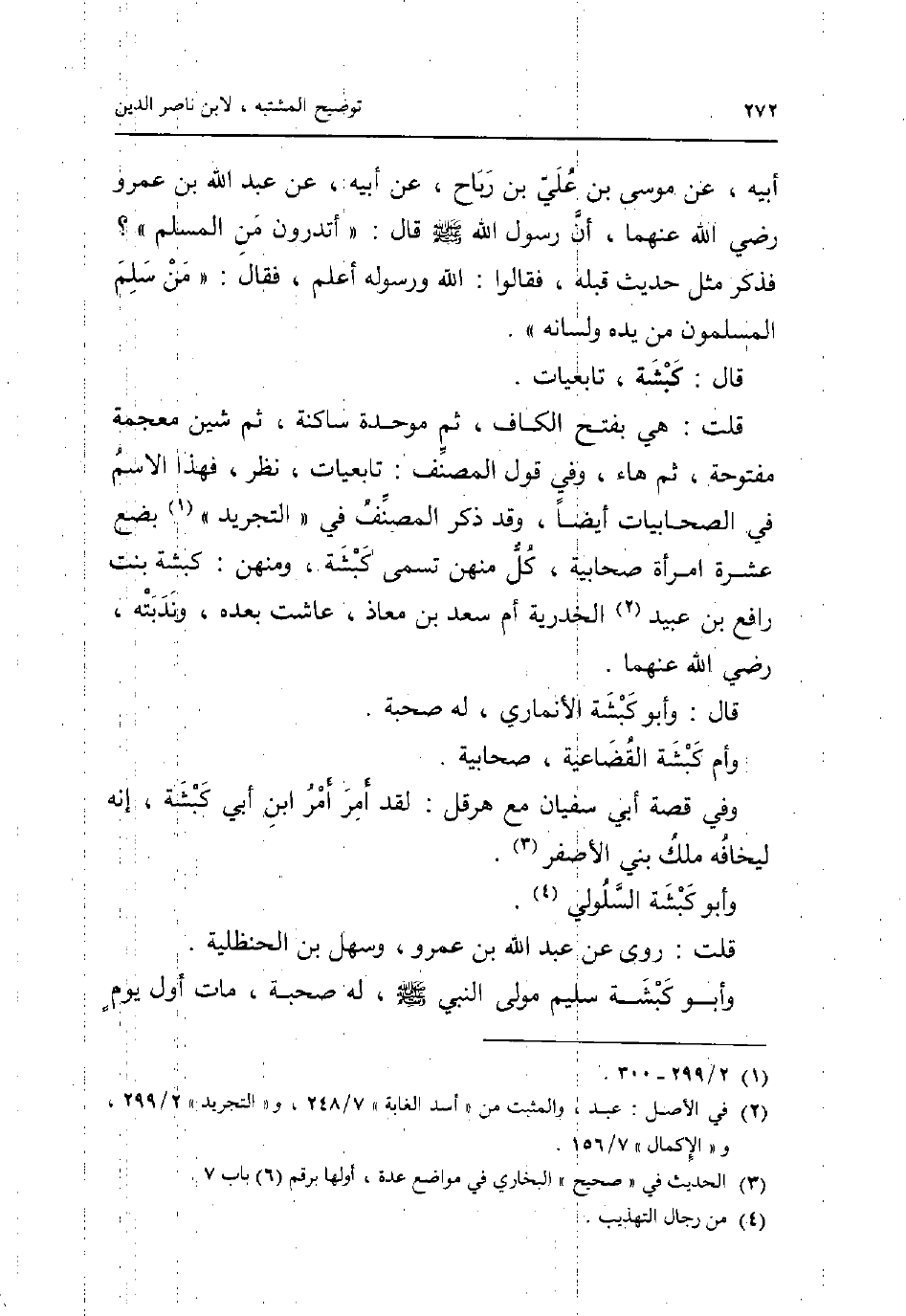 أَبِيه عَن مُوسَى بن عَليّ بن رَبَاح عَن أَبِيه عَن عبد الله بن عَمْرو رَضِي الله عَنْهُمَا أَن رَسُول الله صلى الله عَلَيْهِ وَسلم قَالَ: أَتَدْرُونَ من الْمُسلم؟ فَذكر مثل حَدِيث قبله فَقَالُوا: الله وَرَسُوله أعلم فَقَالَ: من سلم الْمُسلمُونَ من يَده وَلسَانه. قَالَ: كَبْشَة تابعيات. قلت: هِيَ بِفَتْح الْكَاف ثمَّ مُوَحدَة سَاكِنة ثمَّ شين مُعْجمَة مَفْتُوحَة ثمَّ هَاء وَفِي قَول المُصَنّف: تابعيات نظر فَهَذَا الِاسْم فِي الصحابيات أَيْضا وَقد ذكر المُصَنّف فِي التَّجْرِيد بضع عشرَة امْرَأَة صحابية كل مِنْهُنَّ تسمى كَبْشَة ومنهن: كَبْشَة بنت رَافع بن عبيد الخدرية أم سعد بن معَاذ عاشت بعده وندبته رَضِي الله عَنْهُمَا. قَالَ: وَأَبُو كَبْشَة الْأَنمَارِي لَهُ صُحْبَة. وَأم كَبْشَة القضاعية صحابية. وَفِي قصَّة أبي سُفْيَان مَعَ هِرقل: لقد أَمر أَمر ابْن أبي كَبْشَة إِنَّه لَيَخَافهُ ملك بني الْأَصْفَر. وَأَبُو كَبْشَة السَّلُولي. قلت: روى عَن عبد الله بن عَمْرو وَسَهل بن الحنظلية. وَأَبُو كَبْشَة سليم مولى النَّبِي صلى الله عَلَيْهِ وَسلم لَهُ صُحْبَة مَاتَ أول يَوْم
