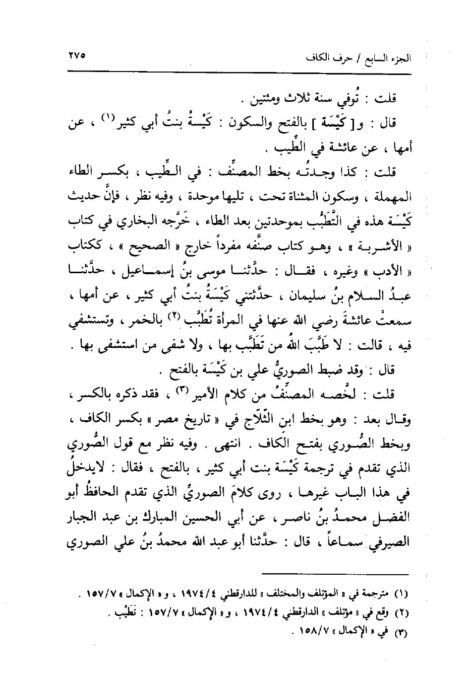 قلت: توفّي سنة ثَلَاث ومئتين. قَالَ: و [كيسة] بِالْفَتْح والسكون: كيسة بنت أبي كثير عَن أمهَا عَن عَائِشَة فِي الطّيب. قلت: كَذَا وجدته بِخَط المُصَنّف: فِي الطّيب بِكَسْر الطَّاء الْمُهْملَة وَسُكُون الْمُثَنَّاة تَحت تَلِيهَا مُوَحدَة وَفِيه نظر فَإِن حَدِيث كيسة هَذِه فِي التطبب بموحدتين بعد الطَّاء خرجه البُخَارِيّ فِي كتاب الْأَشْرِبَة وَهُوَ كتاب صنفه مُفردا خَارج الصَّحِيح ككتاب الْأَدَب وَغَيره فَقَالَ: حَدثنَا مُوسَى بن إِسْمَاعِيل حَدثنَا عبد السَّلَام بن سُلَيْمَان حَدَّثتنِي كيسة بنت أبي كثير عَن أمهَا سَمِعت عَائِشَة رَضِي الله عَنْهَا فِي الْمَرْأَة تطبب بِالْخمرِ وتستشفي فِيهِ قَالَت: لَا طبب الله من تطبب بهَا وَلَا شفى من استشفى بهَا. قَالَ: وَقد ضبط الصُّورِي عَليّ بن كيسة بِالْفَتْح. قلت: لخصه المُصَنّف من كَلَام الْأَمِير فقد ذكره بِالْكَسْرِ وَقَالَ بعد: وَهُوَ بِخَط ابْن الثلاج فِي تَارِيخ مصر بِكَسْر الْكَاف وبخط الصُّورِي بِفَتْح الْكَاف. انْتهى. وَفِيه نظر مَعَ قَول الصُّورِي الَّذِي تقدم فِي تَرْجَمَة كيسة بنت أبي كثير بِالْفَتْح فَقَالَ: لَا يدْخل فِي هَذَا الْبَاب غَيرهَا روى كَلَام الصُّورِي الَّذِي تقدم الْحَافِظ أَبُو الْفضل مُحَمَّد بن نَاصِر عَن أبي الْحُسَيْن الْمُبَارك بن عبد الْجَبَّار الصَّيْرَفِي سَمَاعا قَالَ: حَدثنَا أَبُو عبد الله مُحَمَّد بن عَليّ الصُّورِي