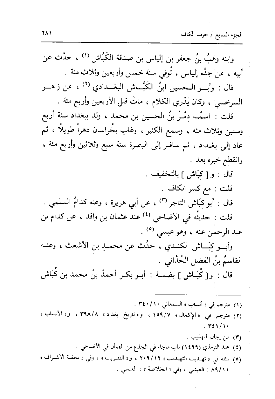 وَابْنه وهب بن جَعْفَر بن إلْيَاس بن صَدَقَة الكباش حدث عَن أَبِيه عَن جده إلْيَاس توفّي سنة خمس وَأَرْبَعين وَثَلَاث مئة. قَالَ: وَأَبُو الْحُسَيْن ابْن الكباش الْبَغْدَادِيّ عَن زَاهِر السَّرخسِيّ وَكَانَ يدْرِي الْكَلَام مَاتَ قبل الْأَرْبَعين وَأَرْبع مئة. قلت: اسْمه ذمر بن الْحُسَيْن بن مُحَمَّد ولد بِبَغْدَاد سنة أَربع وَسِتِّينَ وَثَلَاث مئة وَسمع الْكثير وَغَابَ بخراسان دهرا طَويلا ثمَّ عَاد إِلَى بَغْدَاد ثمَّ سَافر إِلَى الْبَصْرَة سنة سبع وَثَلَاثِينَ وَأَرْبع مئة وَانْقطع خَبره بعد. قَالَ: و [كباش] بِالتَّخْفِيفِ. قلت: مَعَ كسر الْكَاف. قَالَ: أَبُو كباش التَّاجِر عَن أبي هُرَيْرَة وَعنهُ كدام السّلمِيّ. قلت: حَدِيثه فِي الْأَضَاحِي عِنْد عُثْمَان بن وَاقد عَن كدام بن عبد الرَّحْمَن عَنهُ وَهُوَ عبسي. وَأَبُو كباش الْكِنْدِيّ حدث عَن مُحَمَّد بن الْأَشْعَث وَعنهُ الْقَاسِم بن الْفضل الْحدانِي. قَالَ: و [كباش] بضمة: أَبُو بكر أَحْمد بن مُحَمَّد بن كباش