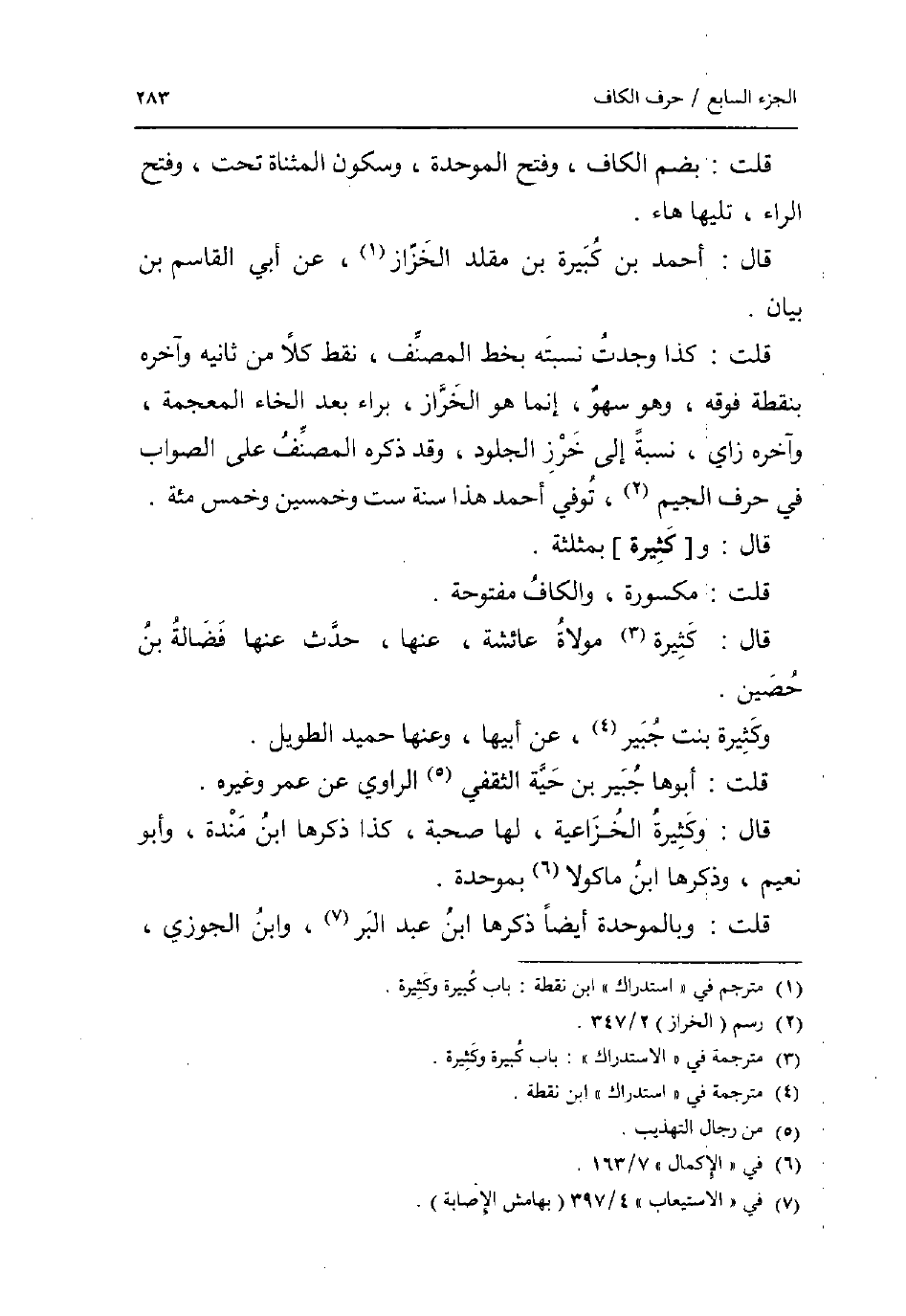 قلت: بِضَم الْكَاف وَفتح الْمُوَحدَة وَسُكُون الْمُثَنَّاة تَحت وَفتح الرَّاء تَلِيهَا هَاء. قَالَ: أَحْمد بن كَبِيرَة بن مقلد الخزاز عَن أبي الْقَاسِم بن بَيَان. قلت: كَذَا وجدت نسبته بِخَط المُصَنّف نقط كلا من ثَانِيه وَآخره بِنُقْطَة فَوْقه وَهُوَ سَهْو إِنَّمَا هُوَ الخراز برَاء بعد الْخَاء الْمُعْجَمَة وَآخره زَاي نِسْبَة إِلَى خرز الْجُلُود وَقد ذكره المُصَنّف على الصَّوَاب فِي حرف الْجِيم توفّي أَحْمد هَذَا سنة سِتّ وَخمسين وَخمْس مئة. قَالَ: و [كَثِيرَة] بمثلثة. قلت: مَكْسُورَة وَالْكَاف مَفْتُوحَة. قَالَ: كَثِيرَة مولاة عَائِشَة عَنْهَا حدث عَنْهَا فضَالة بن حُصَيْن. وكثيرة بنت جُبَير عَن أَبِيهَا وعنها حميد الطَّوِيل. قلت: أَبوهَا جُبَير بن حَيَّة الثَّقَفِيّ الرَّاوِي عَن عمر وَغَيره. قَالَ: وكثيرة الْخُزَاعِيَّة لَهَا صُحْبَة كَذَا ذكرهَا ابْن مندة وَأَبُو نعيم وَذكرهَا ابْن مَاكُولَا بموحدة. قلت: وبالموحدة أَيْضا ذكرهَا ابْن عبد الْبر وَابْن الْجَوْزِيّ