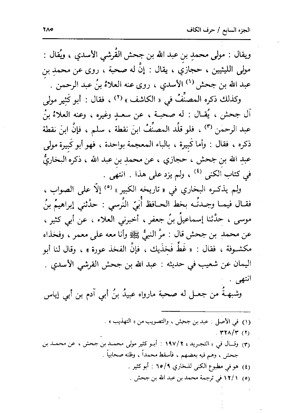 وَيُقَال: مولى مُحَمَّد بن عبد الله بن جحش الْقرشِي الْأَسدي وَيُقَال: مولى الليثيين حجازي يُقَال: إِن لَهُ صُحْبَة روى عَن مُحَمَّد بن عبد الله بن جحش الْأَسدي روى عَنهُ الْعَلَاء بن عبد الرَّحْمَن. وَكَذَلِكَ ذكره المُصَنّف فِي الكاشف فَقَالَ: أَبُو كثير مولى آل جحش يُقَال: لَهُ صُحْبَة عَن سعد وَغَيره وَعنهُ الْعَلَاء بن عبد الرَّحْمَن فَلَو قلد المُصَنّف ابْن نقطة سلم فَإِن ابْن نقطة ذكره فَقَالَ: وَأما كَبِيرَة بِالْبَاء الْمُعْجَمَة بِوَاحِدَة فَهُوَ أَبُو كَبِيرَة مولى عبد الله بن جحش حجازي عَن مُحَمَّد بن عبد الله ذكره البُخَارِيّ فِي كتاب الكنى وَلم يزدْ على هَذَا. انْتهى. وَلم يذكرهُ البُخَارِيّ فِي تَارِيخه الْكَبِير إِلَّا على الصَّوَاب فَقَالَ فِيمَا وجدته بِخَط الْحَافِظ أبي النَّرْسِي: حَدثنِي إِبْرَاهِيم بن مُوسَى حَدثنَا إِسْمَاعِيل بن جَعْفَر أَخْبرنِي الْعَلَاء عَن أبي كثير عَن مُحَمَّد بن جحش قَالَ: مر النَّبِي صلى الله عَلَيْهِ وَسلم وَأَنا مَعَه على معمر وفخذاه مكشوفة فَقَالَ: غط فخذيك فَإِن الْفَخْذ عَورَة وَقَالَ لنا أَبُو الْيَمَان عَن شُعَيْب فِي حَدِيثه: عبد الله بن جحش الْقرشِي الْأَسدي. انْتهى. وشبهة من جعل لَهُ صُحْبَة مَا رَوَاهُ عبيد بن أبي آدم بن أبي إِيَاس