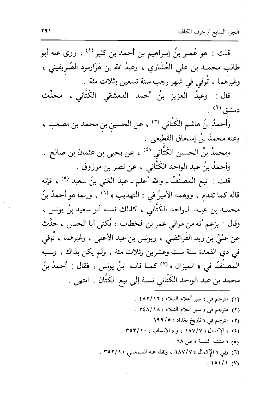 قلت: هُوَ عمر بن إِبْرَاهِيم بن أَحْمد بن كثير روى عَنهُ أَبُو طَالب مُحَمَّد بن عَليّ العشاري وَعبد الله بن هزارمرد الصريفيني وَغَيرهمَا توفّي فِي شهر رَجَب سنة تسعين وَثَلَاث مئة. قَالَ: وَعبد الْعَزِيز بن أَحْمد الدِّمَشْقِي الكتاني مُحدث دمشق. وَأحمد بن هَاشم الكتاني عَن الْحُسَيْن بن مُحَمَّد بن مُصعب وَعنهُ مُحَمَّد بن إِسْحَاق الْقطيعِي. وَمُحَمّد بن الْحُسَيْن الكتاني عَن يحيى بن عُثْمَان بن صَالح وَأحمد بن عبد الْوَاحِد الكتاني عَن نصر بن مَرْزُوق. قلت: تبع المُصَنّف - وَالله أعلم - عبد الْغَنِيّ بن سعيد فَإِنَّهُ قَالَه كَمَا تقدم ووهمه الْأَمِير فِي التَّهْذِيب وَإِنَّمَا هُوَ أَحْمد بن مُحَمَّد بن عبد الْوَاحِد الكتاني كَذَلِك نسبه أَبُو سعيد بن يُونُس وَقَالَ: يزْعم أَنه من موَالِي عمر بن الْخطاب يكنى أَبَا الْحسن حدث عَن عَليّ بن زيد الْفَرَائِضِي وَيُونُس بن عبد الْأَعْلَى وَغَيرهمَا توفّي فِي ذِي الْقعدَة سنة سِتّ وَعشْرين وَثَلَاث مئة وَلم يكن بِذَاكَ وَنسبه المُصَنّف فِي الْمِيزَان كَمَا قَالَه ابْن يُونُس فَقَالَ: أَحْمد بن مُحَمَّد بن عبد الْوَاحِد الكتاني نِسْبَة إِلَى بيع الْكَتَّان. انْتهى