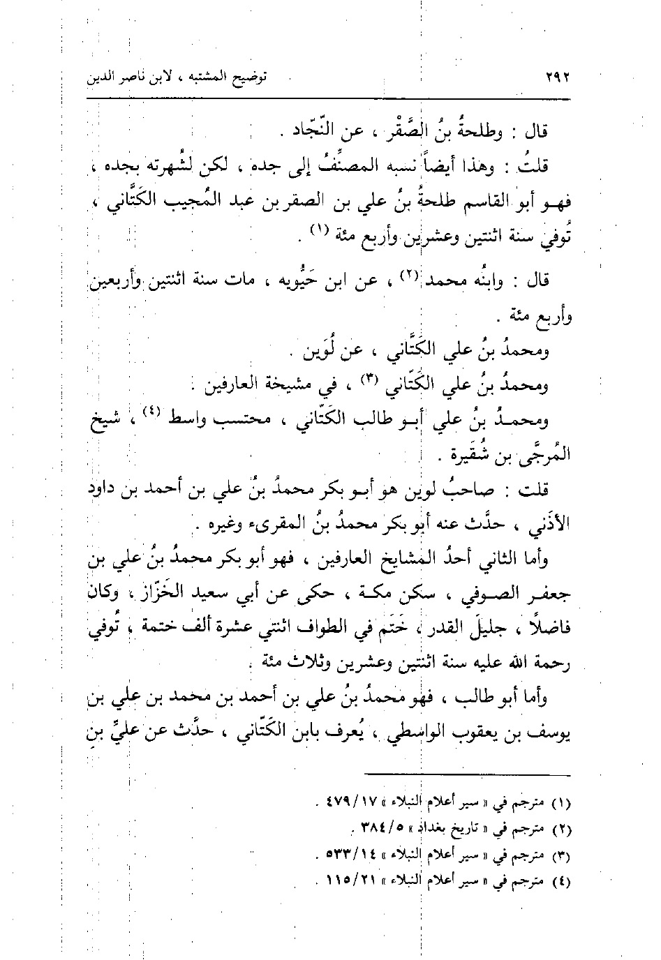 قَالَ: وَطَلْحَة بن الصَّقْر عَن النجاد. قلت: وَهَذَا أَيْضا نسبه المُصَنّف إِلَى جده لَكِن لشهرته بجده فَهُوَ أَبُو الْقَاسِم طَلْحَة بن عَليّ بن الصَّقْر بن عبد الْمُجيب الكتاني توفّي سنة اثْنَتَيْنِ وَعشْرين وَأَرْبع مئة. قَالَ: وَابْنه مُحَمَّد عَن ابْن حيويه مَاتَ سنة اثْنَتَيْنِ وَأَرْبَعين وَأَرْبع مئة. وَمُحَمّد بن عَليّ الكتاني عَن لوين. وَمُحَمّد بن عَليّ الكتاني فِي مشيخة العارفين. وَمُحَمّد بن عَليّ أَبُو طَالب الكتاني محتسب وَاسِط شيخ المرجى بن شقيرة. قلت: صَاحب لوين هُوَ أَبُو بكر مُحَمَّد بن عَليّ بن أَحْمد بن دَاوُد الأذني حدث عَنهُ أَبُو بكر مُحَمَّد بن الْمُقْرِئ وَغَيره. وَأما الثَّانِي أحد الْمَشَايِخ العارفين فَهُوَ أَبُو بكر مُحَمَّد بن عَليّ بن جَعْفَر الصُّوفِي سكن مَكَّة حكى عَن أبي سعيد الخزاز وَكَانَ فَاضلا جليل الْقدر ختم فِي الطّواف اثْنَتَيْ عشرَة ألف ختمة توفّي رَحْمَة الله عَلَيْهِ سنة اثْنَتَيْنِ وَعشْرين وَثَلَاث مئة. وَأما أَبُو طَالب فَهُوَ مُحَمَّد بن عَليّ بن أَحْمد بن مُحَمَّد بن عَليّ بن يُوسُف بن يَعْقُوب الوَاسِطِيّ يعرف بِابْن الكتاني حدث عَن عَليّ بن