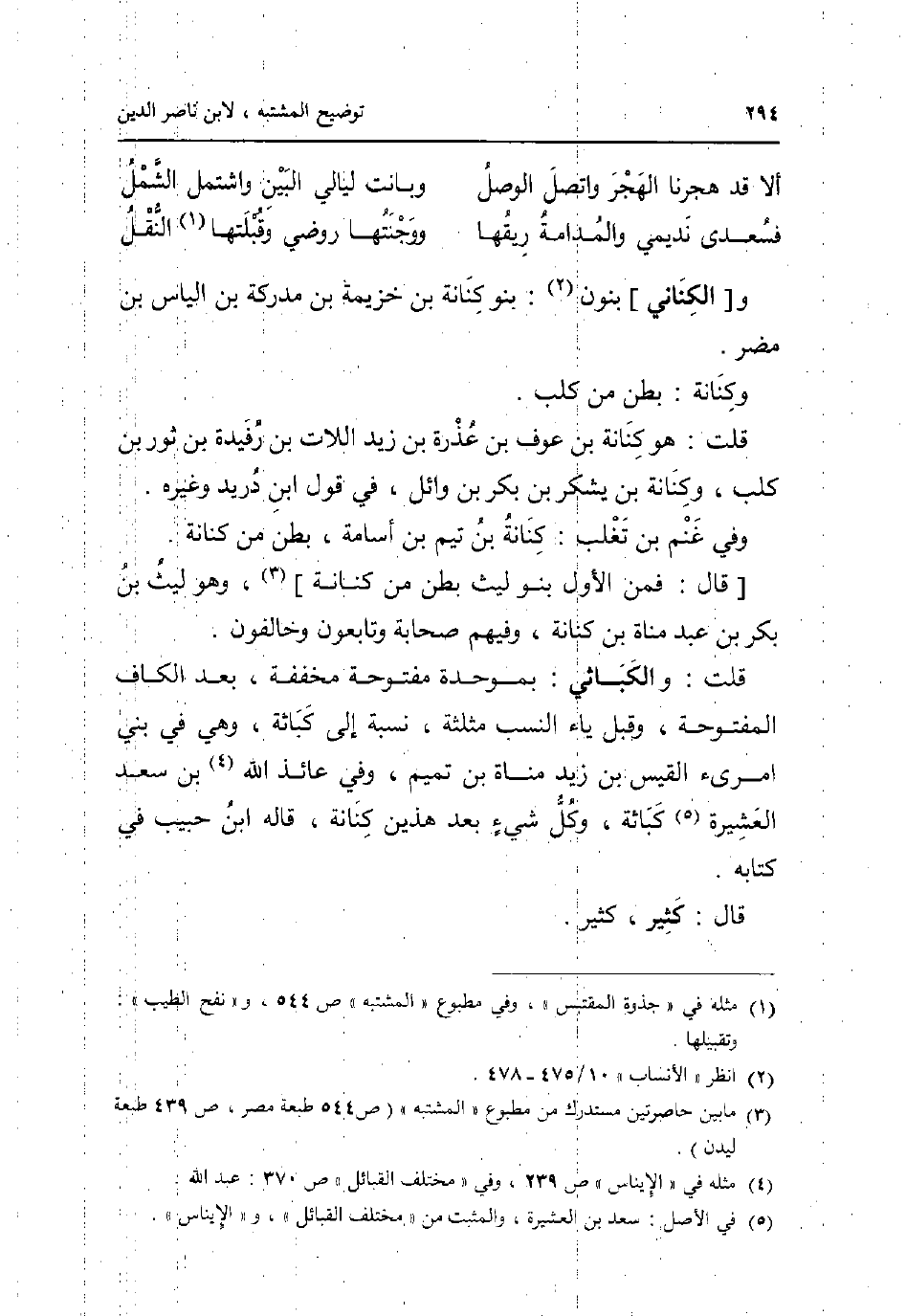 و [الْكِنَانِي] بنُون: بَنو كنَانَة بن خُزَيْمَة بن مدركة بن الياس بن مُضر. وكنانة: بطن من كلب. قلت: هُوَ كنَانَة بن عَوْف بن عذرة بن زيد اللات بن رفيدة بن ثَوْر بن كلب وكنانة بن يشْكر بن بكر بن وَائِل فِي قَول ابْن دُرَيْد وَغَيره. وَفِي غنم بن تغلب: كنَانَة بن تيم بن أُسَامَة بطن من كنَانَة. [قَالَ: فَمن الأول بَنو لَيْث بطن من كنَانَة] وَهُوَ لَيْث بن بكر بن عبد مَنَاة بن كنَانَة وَفِيهِمْ صحابة وتابعون وخالفون. قلت: والكباثي: بموحدة مَفْتُوحَة مُخَفّفَة بعد الْكَاف الْمَفْتُوحَة وَقبل يَاء النّسَب مُثَلّثَة نِسْبَة إِلَى كباثة وَهِي فِي بني امْرِئ الْقَيْس بن زيد مَنَاة بن تَمِيم وَفِي عَائِذ الله بن سعد الْعَشِيرَة كباثة وكل شَيْء بعد هذَيْن كنَانَة قَالَه ابْن حبيب فِي كِتَابه. قَالَ: كثير كثير.