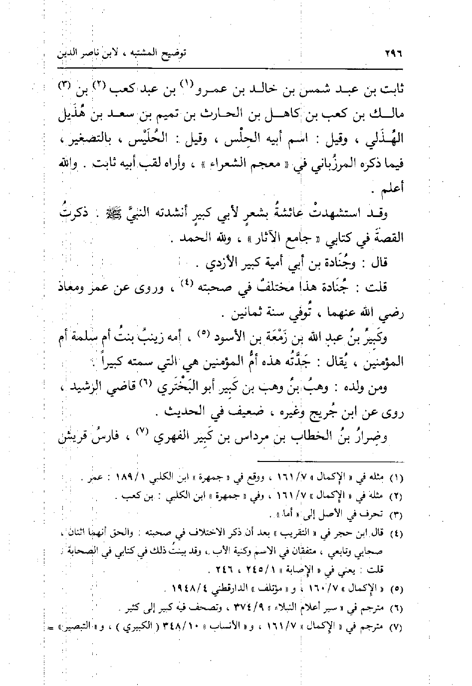 ثَابت بن عبد شمس بن خَالِد بن عَمْرو بن عبد كَعْب بن مَالك بن كَعْب بن كَاهِل بن الْحَارِث بن تَمِيم بن سعد بن هُذَيْل الْهُذلِيّ وَقيل: اسْم أَبِيه الحلس وَقيل: الْحُلَيْس بِالتَّصْغِيرِ فِيمَا ذكره المرزباني فِي مُعْجم الشُّعَرَاء وَأرَاهُ لقب أَبِيه ثَابت. وَالله أعلم. وَقد استشهدت عَائِشَة بِشعر لأبي كَبِير أنشدته النَّبِي صلى الله عَلَيْهِ وَسلم. ذكرت الْقِصَّة فِي كتابي جَامع الْآثَار وَللَّه الْحَمد. قَالَ: وجنادة بن أبي أُميَّة كَبِير الْأَزْدِيّ. قلت: جُنَادَة هَذَا مُخْتَلف فِي صحبته وروى عَن عمر ومعاذ رَضِي الله عَنْهُمَا توفّي سنة ثَمَانِينَ. وكبير بن عبد الله بن زَمعَة بن الْأسود أمه زَيْنَب بنت أم سَلمَة أم الْمُؤمنِينَ يُقَال: جدته هَذِه أم الْمُؤمنِينَ هِيَ الَّتِي سمته كَبِيرا. وَمن وَلَده: وهب بن وهب بن كَبِير أَبُو البخْترِي قَاضِي الرشيد روى عَن ابْن جريج وَغَيره ضَعِيف فِي الحَدِيث. وَضِرَار بن الْخطاب بن مرداس بن كَبِير الفِهري فَارس قُرَيْش