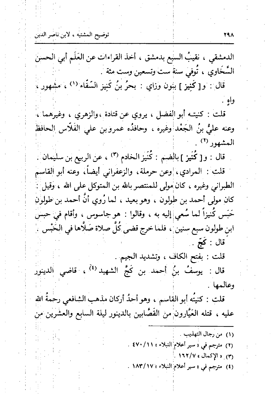 الدِّمَشْقِي نقيب السَّبع بِدِمَشْق أَخذ الْقرَاءَات عَن الْعلم أبي الْحسن السخاوي توفّي سنة سِتّ وَتِسْعين وست مئة. قَالَ: و [كنيز] بنُون وزاي: بَحر بن كنيز السقاء مَشْهُور واه. قلت: كنيته أَبُو الْفضل يروي عَن قَتَادَة وَالزهْرِيّ وَغَيرهمَا وَعنهُ عَليّ بن الْجَعْد وَغَيره وحافده عَمْرو بن عَليّ الفلاس الْحَافِظ الْمَشْهُور. قَالَ: و [كنيز] بِالضَّمِّ: كنيز الْخَادِم عَن الرّبيع بن سُلَيْمَان. قلت: الْمرَادِي وَعَن حَرْمَلَة والزعفراني أَيْضا وَعنهُ أَبُو الْقَاسِم الطَّبَرَانِيّ وَغَيره كَانَ مولى للمنتصر بِاللَّه بن المتَوَكل على الله وَقيل: كَانَ مولى أَحْمد بن طولون وَهُوَ بعيد لما رُوِيَ أَن أَحْمد بن طولون حبس كنيزا لما سعي إِلَيْهِ بِهِ وَقَالُوا: هُوَ جاسوس وَأقَام فِي حبس ابْن طولون سبع سِنِين فَلَمَّا خرج قضى كل صَلَاة صلاهَا فِي الْحَبْس. قَالَ: كج. قلت: بِفَتْح الْكَاف وَتَشْديد الْجِيم. قَالَ: يُوسُف بن أَحْمد بن كج الشَّهِيد قَاضِي الدينور وعالمها. قلت: كنيته أَبُو الْقَاسِم وَهُوَ أحد أَرْكَان مَذْهَب الشَّافِعِي رَحْمَة الله عَلَيْهِ قَتله العيارون من القصابين بالدينور لَيْلَة السَّابِع وَالْعِشْرين من