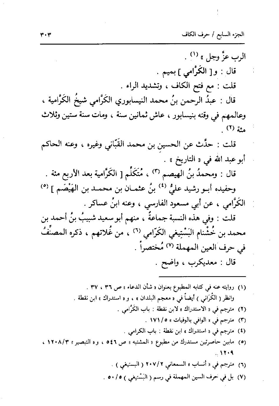 الرب عز وَجل. قَالَ: و [الكرامي] بميم. قلت: مَعَ فتح الْكَاف وَتَشْديد الرَّاء. قَالَ: عبد الرَّحْمَن بن مُحَمَّد النَّيْسَابُورِي الكرامي شيخ الكرامية وعالمهم فِي وقته بنيسابور عَاشَ ثَمَانِينَ سنة وَمَات سنة سِتِّينَ وَثَلَاث مئة. قلت: حدث عَن الْحُسَيْن بن مُحَمَّد القباني وَغَيره وَعنهُ الْحَاكِم أَبُو عبد الله فِي التَّارِيخ. قَالَ: وَمُحَمّد بن الهيصم مُتَكَلم [الكرامية بعد الْأَرْبَع مئة. وحفيده أَبُو رشيد عَليّ بن عُثْمَان بن مُحَمَّد بن الهيصم] الكرامي عَن أبي مَسْعُود الْفَارِسِي وَعنهُ ابْن عَسَاكِر. قلت: وَفِي هَذِه النِّسْبَة جمَاعَة مِنْهُم أَبُو سعيد شبيب بن أَحْمد بن مُحَمَّد بن خشنام البستيغي الكرامي من غلاتهم ذكره المُصَنّف فِي حرف الْعين الْمُهْملَة مُخْتَصرا. قَالَ: معديكرب وَاضح.