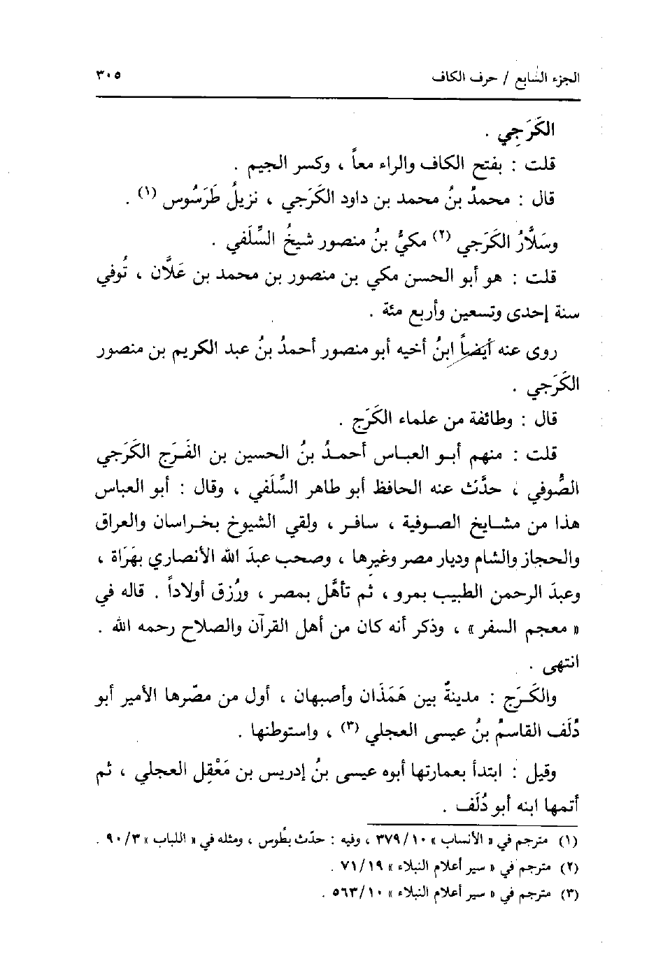 الكرجي. قلت: بِفَتْح الْكَاف وَالرَّاء مَعًا وَكسر الْجِيم. قَالَ: مُحَمَّد بن مُحَمَّد بن دَاوُد الكرجي نزيل طرسوس. وسلار الكرجي مكي بن مَنْصُور شيخ السلَفِي. قلت: هُوَ أَبُو الْحسن مكي بن مَنْصُور بن مُحَمَّد بن عَلان توفّي سنة إِحْدَى وَتِسْعين وَأَرْبع مئة. روى عَنهُ أَيْضا ابْن أَخِيه أَبُو مَنْصُور أَحْمد بن عبد الْكَرِيم بن مَنْصُور الكرجي. قَالَ: وَطَائِفَة من عُلَمَاء الكرج. قلت: مِنْهُم أَبُو الْعَبَّاس أَحْمد بن الْحُسَيْن بن الْفرج الكرجي الصُّوفِي حدث عَنهُ الْحَافِظ أَبُو طَاهِر السلَفِي وَقَالَ: أَبُو الْعَبَّاس هَذَا من مَشَايِخ الصُّوفِيَّة سَافر وَلَقي الشُّيُوخ بخراسان وَالْعراق والحجاز وَالشَّام وديار مصر وَغَيرهَا وَصَحب عبد الله الْأنْصَارِيّ بهراة وَعبد الرَّحْمَن الطَّبِيب بمرو ثمَّ تأهل بِمصْر ورزق أَوْلَادًا. قَالَه فِي مُعْجم السّفر وَذكر أَنه كَانَ من أهل الْقُرْآن وَالصَّلَاح رَحمَه الله. انْتهى. والكرج: مَدِينَة بَين همذان وأصبهان أول من مصرها الْأَمِير أَبُو دلف الْقَاسِم بن عِيسَى الْعجلِيّ واستوطنها. وَقيل: ابْتَدَأَ بعمارتها أَبوهُ عِيسَى بن إِدْرِيس بن معقل الْعجلِيّ ثمَّ أتمهَا ابْنه أَبُو دلف.