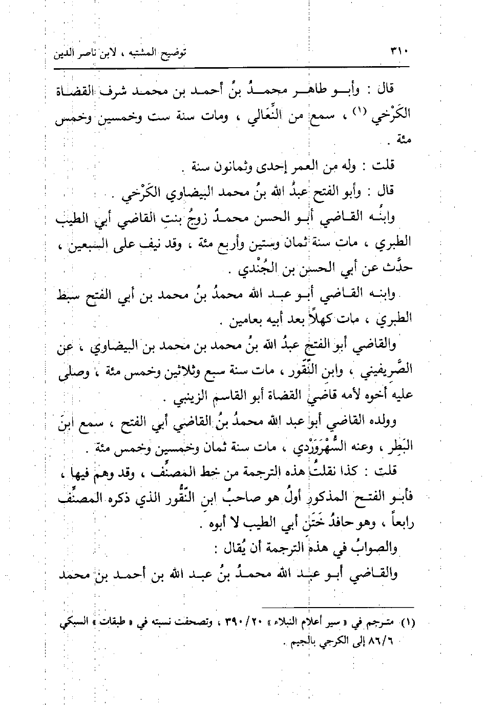 قَالَ: وَأَبُو طَاهِر مُحَمَّد بن أَحْمد بن مُحَمَّد شرف الْقُضَاة الْكَرْخِي سمع من النعالي وَمَات سنة سِتّ وَخمسين وَخمْس مئة. قلت: وَله من الْعُمر إِحْدَى وَثَمَانُونَ سنة. قَالَ: وَأَبُو الْفَتْح عبد الله بن مُحَمَّد الْبَيْضَاوِيّ الْكَرْخِي. وَابْنه القَاضِي أَبُو الْحسن مُحَمَّد زوج بنت القَاضِي أبي الطّيب الطَّبَرِيّ مَاتَ سنة ثَمَان وَسِتِّينَ وَأَرْبع مئة وَقد نَيف على السّبْعين حدث عَن أبي الْحسن بن الجندي. وَابْنه القَاضِي أَبُو عبد الله مُحَمَّد بن مُحَمَّد بن أبي الْفَتْح سبط الطَّبَرِيّ مَاتَ كهلا بعد أَبِيه بعامين. وَالْقَاضِي أَبُو الْفَتْح عبد الله بن مُحَمَّد بن مُحَمَّد بن الْبَيْضَاوِيّ عَن الصريفيني وَابْن النقور مَاتَ سنة سبع وَثَلَاثِينَ وَخمْس مئة وَصلى عَلَيْهِ أَخُوهُ لأمه قَاضِي الْقُضَاة أَبُو الْقَاسِم الزَّيْنَبِي. وَولده القَاضِي أَبُو عبد الله مُحَمَّد بن القَاضِي أبي الْفَتْح سمع ابْن البطر وَعنهُ السهروردي مَاتَ سنة ثَمَان وَخمسين وَخمْس مئة. قلت: كَذَا نقلت هَذِه التَّرْجَمَة من خطّ المُصَنّف وَقد وهم فِيهَا فَأَبُو الْفَتْح الْمَذْكُور أول هُوَ صَاحب ابْن النقور الَّذِي ذكره المُصَنّف رَابِعا وَهُوَ حافد ختن أبي الطّيب لَا أَبوهُ. وَالصَّوَاب فِي هَذِه التَّرْجَمَة أَن يُقَال: وَالْقَاضِي أَبُو عبد الله مُحَمَّد بن عبد الله بن أَحْمد بن مُحَمَّد