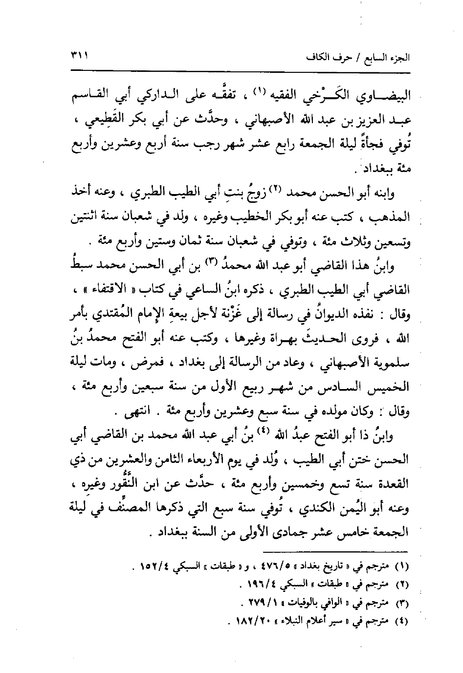 الْبَيْضَاوِيّ الْكَرْخِي الْفَقِيه تفقه على الداركي أبي الْقَاسِم عبد الْعَزِيز بن عبد الله الْأَصْبَهَانِيّ وَحدث عَن أبي بكر الْقطيعِي توفّي فَجْأَة لَيْلَة الْجُمُعَة رَابِع عشر شهر رَجَب سنة أَربع وَعشْرين وَأَرْبع مئة بِبَغْدَاد. وَابْنه أَبُو الْحسن مُحَمَّد زوج بنت أبي الطّيب الطَّبَرِيّ وَعنهُ أَخذ الْمَذْهَب كتب عَنهُ أَبُو بكر الْخَطِيب وَغَيره ولد فِي شعْبَان سنة اثْنَتَيْنِ وَتِسْعين وَثَلَاث مئة وَتُوفِّي فِي شعْبَان سنة ثَمَان وَسِتِّينَ وَأَرْبع مئة. وَابْن هَذَا القَاضِي أَبُو عبد الله مُحَمَّد بن أبي الْحسن مُحَمَّد سبط القَاضِي أبي الطّيب الطَّبَرِيّ ذكره ابْن السَّاعِي فِي كتاب الاقتفاء وَقَالَ: نفذه الدِّيوَان فِي رِسَالَة إِلَى غزنة لأجل بيعَة الإِمَام الْمُقْتَدِي بِأَمْر الله فروى الحَدِيث بهراة وَغَيرهَا وَكتب عَنهُ أَبُو الْفَتْح مُحَمَّد بن سلموية الْأَصْبَهَانِيّ وَعَاد من الرسَالَة إِلَى بَغْدَاد فَمَرض وَمَات لَيْلَة الْخَمِيس السَّادِس من شهر ربيع الأول من سنة سبعين وَأَرْبع مئة وَقَالَ: وَكَانَ مولده فِي سنة سبع وَعشْرين وَأَرْبع مئة. انْتهى. وَابْن ذَا أَبُو الْفَتْح عبد الله بن أبي عبد الله مُحَمَّد بن القَاضِي أبي الْحسن ختن أبي الطّيب ولد فِي يَوْم الْأَرْبَعَاء الثَّامِن وَالْعِشْرين من ذِي الْقعدَة سنة تسع وَخمسين وَأَرْبع مئة حدث عَن ابْن النقور وَغَيره وَعنهُ أَبُو الْيمن الْكِنْدِيّ توفّي سنة سبع الَّتِي ذكرهَا المُصَنّف فِي لَيْلَة الْجُمُعَة خَامِس عشر جُمَادَى الأولى من السّنة بِبَغْدَاد.