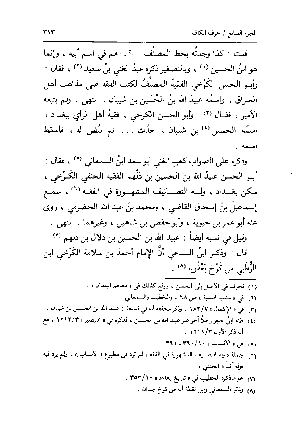 قلت: كَذَا وجدته بِخَط المُصَنّف وَقد وهم فِي اسْم أَبِيه وَإِنَّمَا هُوَ ابْن الْحُسَيْن وبالتصغير ذكره عبد الْغَنِيّ بن سعيد فَقَالَ: وَأَبُو الْحسن الْكَرْخِي الْفَقِيه المُصَنّف لكتب الْفِقْه على مَذَاهِب أهل الْعرَاق واسْمه عبيد الله بن الْحُسَيْن بن شَيبَان. انْتهى. وَلم يتبعهُ الْأَمِير فَقَالَ: وَأَبُو الْحسن الْكَرْخِي فَقِيه أهل الرَّأْي بِبَغْدَاد اسْمه الْحُسَيْن بن شَيبَان حدث ... . . ثمَّ بيض لَهُ فأسقط اسْمه. وَذكره على الصَّوَاب كَعبد الْغَنِيّ أَبُو سعد ابْن السَّمْعَانِيّ فَقَالَ: أَبُو الْحسن عبيد الله بن الْحُسَيْن بن دلهم الْفَقِيه الْحَنَفِيّ الْكَرْخِي سكن بَغْدَاد وَله التصانيف الْمَشْهُورَة فِي الْفِقْه سمع إِسْمَاعِيل بن إِسْحَاق القَاضِي وَمُحَمّد بن عبد الله الْحَضْرَمِيّ روى عَنهُ أَبُو عمر بن حيوية وَأَبُو حَفْص بن شاهين وَغَيرهمَا. انْتهى. وَقيل فِي نسبه أَيْضا: عبيد الله بن الْحُسَيْن بن دلال بن دلهم. قَالَ: وَذكر ابْن السَّاعِي أَن الإِمَام أَحْمد بن سَلامَة الْكَرْخِي ابْن الرطبي من كرخ بعقوبا.