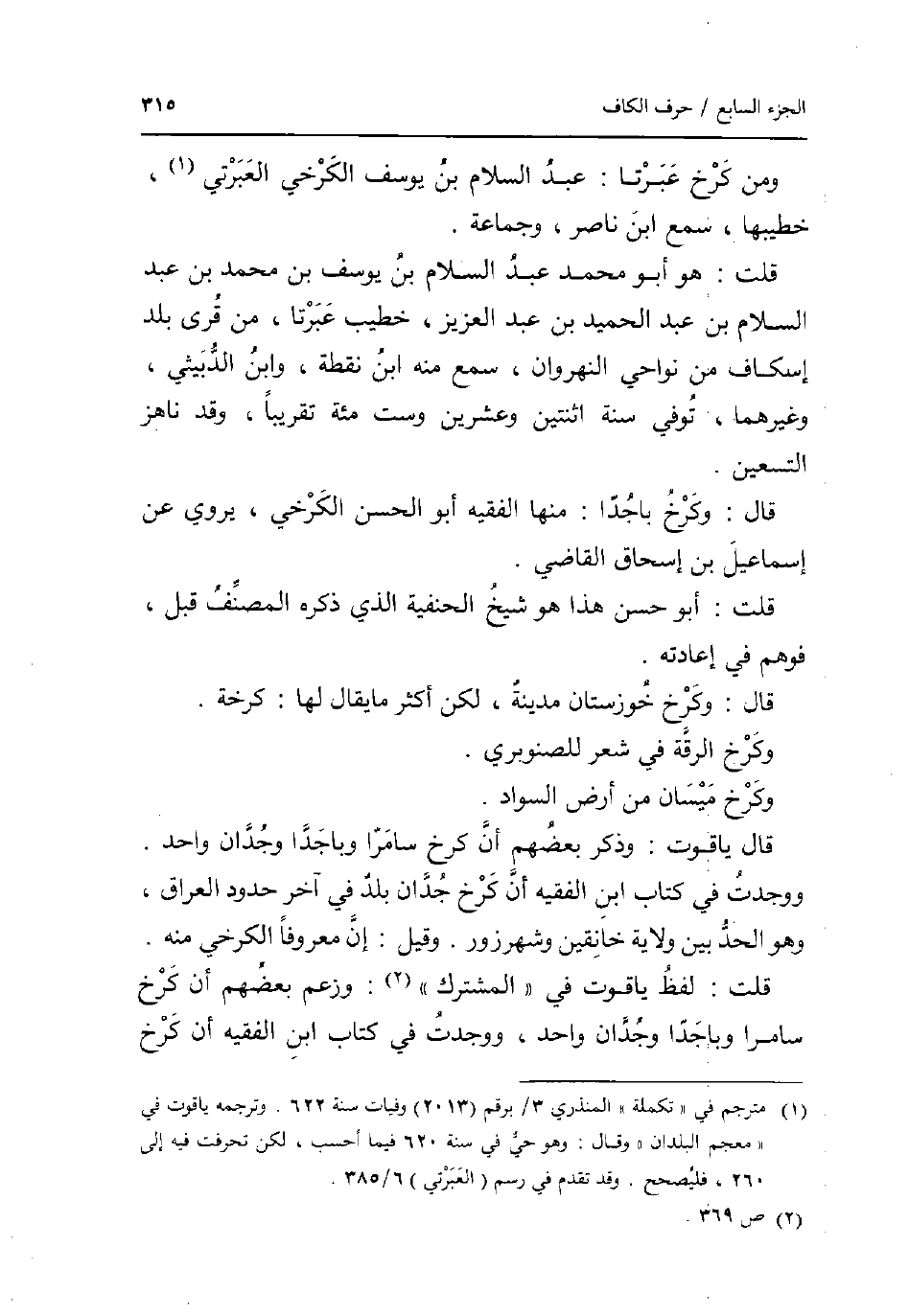 وَمن كرخ عبرتا: عبد السَّلَام بن يُوسُف الْكَرْخِي العبرتي خطيبها سمع ابْن نَاصِر وَجَمَاعَة. قلت: هُوَ أَبُو مُحَمَّد عبد السَّلَام بن يُوسُف بن مُحَمَّد بن عبد السَّلَام بن عبد الحميد بن عبد الْعَزِيز خطيب عبرتا من قرى بلد إسكاف من نواحي النهروان سمع مِنْهُ ابْن نقطة وَابْن الدبيثي وَغَيرهمَا توفّي سنة اثْنَتَيْنِ وَعشْرين وست مئة تَقْرِيبًا وَقد ناهز التسعين. قَالَ: وكرخ باجدا: مِنْهَا الْفَقِيه أَبُو الْحسن الْكَرْخِي يروي عَن إِسْمَاعِيل بن إِسْحَاق القَاضِي. قلت: أَبُو حسن هَذَا هُوَ شيخ الْحَنَفِيَّة الَّذِي ذكره المُصَنّف قبل فَوَهم فِي إِعَادَته. قَالَ: وكرخ خوزستان مَدِينَة لَكِن أَكثر مَا يُقَال لَهَا: كرخة. وكرخ الرقة فِي شعر للصنوبري. وكرخ ميسَان من أَرض السوَاد. قَالَ ياقوت: وَذكر بَعضهم أَن كرخ سامرا وباجدا وجدان وَاحِد. وَوجدت فِي كتاب ابْن الْفَقِيه أَن كرخ جدان بلد فِي أخر حُدُود الْعرَاق وَهُوَ الْحَد بَين ولَايَة خانقين وشهرزور. وَقيل: إِن مَعْرُوفا الْكَرْخِي مِنْهُ. قلت: لفظ ياقوت فِي الْمُشْتَرك: وَزعم بَعضهم أَن كرخ سامرا وباجدا وجدان وَاحِد وَوجدت فِي كتاب ابْن الْفَقِيه أَن كرخ