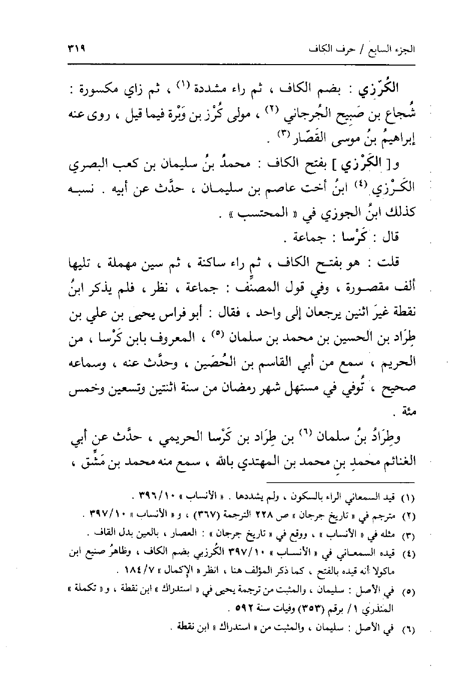 الكرزي: بِضَم الْكَاف ثمَّ رَاء مُشَدّدَة ثمَّ زَاي مَكْسُورَة: شُجَاع بن صبيح الْجِرْجَانِيّ مولى كرز بن وبرة فِيمَا قيل روى عَنهُ إِبْرَاهِيم بن مُوسَى الْقصار. و [الكرزي] بِفَتْح الْكَاف: مُحَمَّد بن سُلَيْمَان بن كَعْب الْبَصْرِيّ الكرزي ابْن أُخْت عَاصِم بن سُلَيْمَان حدث عَن أَبِيه. نسبه كَذَلِك ابْن الْجَوْزِيّ فِي الْمُحْتَسب. قَالَ: كرسا: جمَاعَة. قلت: هُوَ بِفَتْح الْكَاف ثمَّ رَاء سَاكِنة ثمَّ سين مُهْملَة تَلِيهَا ألف مَقْصُورَة وَفِي قَول المُصَنّف: جمَاعَة نظر فَلم يذكر ابْن نقطة غير اثْنَيْنِ يرجعان إِلَى وَاحِد فَقَالَ: أَبُو فراس يحيى بن عَليّ بن طراد بن الْحُسَيْن بن مُحَمَّد بن سلمَان الْمَعْرُوف بِابْن كرسا من الْحَرِيم سمع من أبي الْقَاسِم بن الْحصين وَحدث عَنهُ وسماعه صَحِيح توفّي فِي مستهل شهر رَمَضَان من سنة اثْنَتَيْنِ وَتِسْعين وَخمْس مئة. وطراد بن سلمَان بن طراد بن كرسا الحريمي حدث عَن أبي الْغَنَائِم مُحَمَّد بن مُحَمَّد بن الْمُهْتَدي بِاللَّه سمع مِنْهُ مُحَمَّد بن مشق