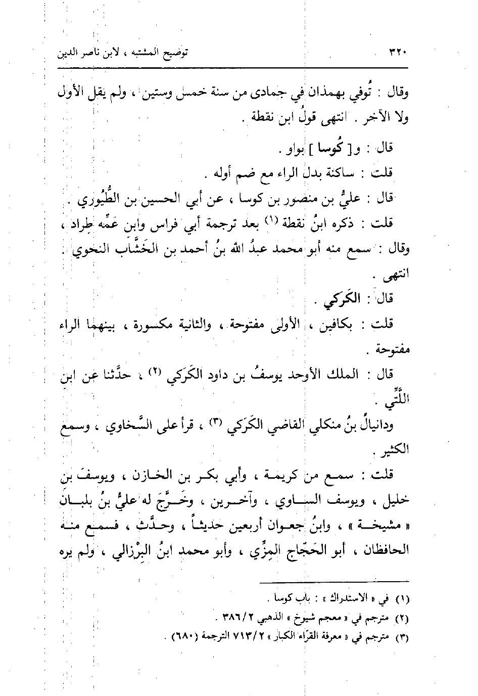 وَقَالَ: توفّي بهمذان فِي جُمَادَى من سنة خمس وَسِتِّينَ وَلم يقل الأول وَلَا الآخر. انْتهى قَول ابْن نقطة. قَالَ: و [كوسا] بواو. قلت: سَاكِنة بدل الرَّاء مَعَ ضم أَوله. قَالَ: عَليّ بن مَنْصُور بن كوسا عَن أبي الْحُسَيْن بن الطيوري. قلت: ذكره ابْن نقطة بعد تَرْجَمَة أبي فراس وَابْن عَمه طراد وَقَالَ: سمع مِنْهُ أَبُو مُحَمَّد عبد الله بن أَحْمد بن الخشاب النَّحْوِيّ. انْتهى. قَالَ: الكركي. قلت: بكافين الأولى مَفْتُوحَة وَالثَّانيَِة مَكْسُورَة بَينهمَا الرَّاء مَفْتُوحَة. قَالَ: الْملك الأوحد يُوسُف بن دَاوُد الكركي حَدثنَا عَن ابْن اللتي. ودانيال بن منكلي القَاضِي الكركي قَرَأَ على السخاوي وَسمع الْكثير. قلت: سمع من كَرِيمَة وَأبي بكر بن الخازن ويوسف بن خَلِيل ويوسف الساوي وَآخَرين وَخرج لَهُ عَليّ بن بلبان مشيخة وَابْن جعوان أَرْبَعِينَ حَدِيثا وَحدث فَسمع مِنْهُ الحافظان أَبُو الْحجَّاج الْمزي وَأَبُو مُحَمَّد ابْن البرزالي وَلم يره