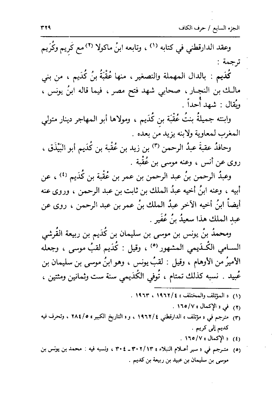 وَعقد الدَّارَقُطْنِيّ فِي كِتَابه وَتَابعه ابْن مَاكُولَا مَعَ كريم وكريم تَرْجَمَة: كديم: بِالدَّال الْمُهْملَة والتصغير مِنْهَا عقبَة بن كديم من بني مَالك بن النجار صَحَابِيّ شهد فتح مصر فِيمَا قَالَه ابْن يُونُس وَيُقَال: شهد أحدا. وَابْنَته جميلَة بنت عقبَة بن كديم ومولاها أَبُو المُهَاجر دِينَار مُتَوَلِّي الْمغرب لمعاوية ولابنه يزِيد من بعده. وحافد عقبَة عبد الرَّحْمَن بن زيد بن عقبَة بن كديم أَبُو البيذق روى عَن أنس وَعنهُ مُوسَى بن عقبَة. وَعبد الرَّحْمَن بن عبد الرَّحْمَن بن عمر بن عقبَة بن كديم عَن أَبِيه وَعنهُ ابْن أَخِيه عبد الْملك بن ثَابت بن عبد الرَّحْمَن وروى عَنهُ أَيْضا ابْن أَخِيه الآخر عبد الْملك بن عمر بن عبد الرَّحْمَن روى عَن عبد الْملك هَذَا سعيد بن عفير. وَمُحَمّد بن يُونُس بن مُوسَى بن سُلَيْمَان بن كديم بن ربيعَة الْقرشِي السَّامِي الْكُدَيْمِي الْمَشْهُور وَقيل: كديم لقب مُوسَى وَجعله الْأَمِير من الأوهام وَقيل: لقب يُونُس وَهُوَ ابْن مُوسَى بن سُلَيْمَان بن عبيد. نسبه كَذَلِك تمْتَام توفّي الْكُدَيْمِي سنة سِتّ وَثَمَانِينَ ومئتين