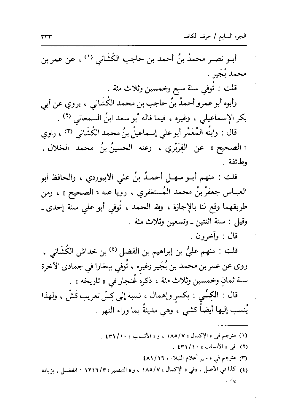 أَبُو نصر مُحَمَّد بن أَحْمد بن حَاجِب الكشاني عَن عمر بن مُحَمَّد بجير. قلت: توفّي سنة سبع وَخمسين وَثَلَاث مئة. وَأَبوهُ أَبُو عَمْرو أَحْمد بن حَاجِب بن مُحَمَّد الكشاني يروي عَن أبي بكر الْإِسْمَاعِيلِيّ وَغَيره فِيمَا قَالَه أَبُو سعد ابْن السَّمْعَانِيّ. قَالَ: وَابْنه المعمر أَبُو عَليّ إِسْمَاعِيل بن مُحَمَّد الكشاني رَاوِي الصَّحِيح عَن الْفربرِي وَعنهُ الْحُسَيْن بن مُحَمَّد الْخلال وَطَائِفَة. قلت: مِنْهُم أَبُو سهل أَحْمد بن عَليّ الأبيوردي والحافظ أَبُو الْعَبَّاس جَعْفَر بن مُحَمَّد المستغفري رويا عَنهُ الصَّحِيح وَمن طريقهما وَقع لنا بِالْإِجَازَةِ وَللَّه الْحَمد توفّي أَبُو عَليّ سنة إِحْدَى - وَقيل: سنة اثْنَتَيْنِ - وَتِسْعين وَثَلَاث مئة. قَالَ: وَآخَرُونَ. قلت: مِنْهُم عَليّ بن إِبْرَاهِيم بن الْفضل بن خِدَاش الكشاني روى عَن عمر بن مُحَمَّد بن بجير وَغَيره توفّي ببخارا فِي جُمَادَى الْآخِرَة سنة ثَمَان وَخمسين وَثَلَاث مئة ذكره غُنْجَار فِي تَارِيخه. قَالَ: الكسي: بِكَسْر وإهمال نِسْبَة إِلَى كس تعريب كش وَلِهَذَا ينْسب إِلَيْهَا أَيْضا كشي وَهِي مَدِينَة بِمَا وَرَاء النَّهر.
