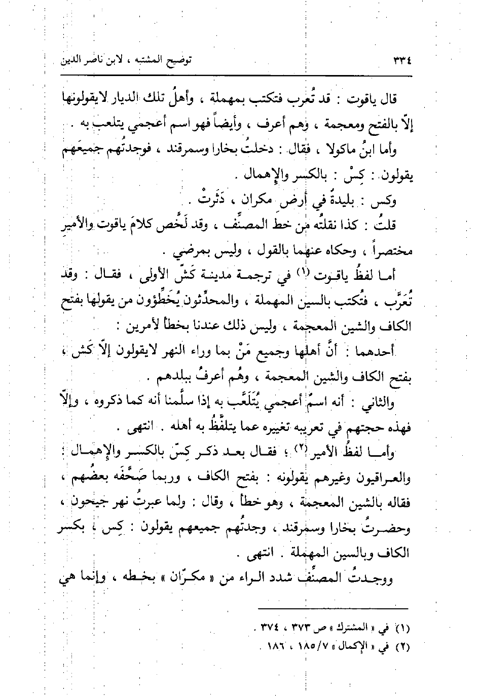 قَالَ ياقوت: قد تعرب فتكتب بِمُهْملَة وَأهل تِلْكَ الديار لَا يَقُولُونَهَا إِلَّا بِالْفَتْح ومعجمة وهم أعرف وَأَيْضًا فَهُوَ اسْم أعجمي يتلعب بِهِ. وَأما ابْن مَاكُولَا فَقَالَ: دخلت بخارا وسمرقند فوجدتهم جَمِيعهم يَقُولُونَ: كس: بِالْكَسْرِ والإهمال. وكس: بليدَة فِي أَرض مكران دثرت. قلت: كَذَا نقلته من خطّ المُصَنّف وَقد لخص كَلَام ياقوت والأمير مُخْتَصرا وَحَكَاهُ عَنْهُمَا بالْقَوْل وَلَيْسَ بمرضي. أما لفظ ياقوت فِي تَرْجَمَة مَدِينَة كش الأولى فَقَالَ: وَقد تعرب فتكتب بِالسِّين الْمُهْملَة والمحدثون يخطؤون من يَقُولهَا بِفَتْح الْكَاف والشين الْمُعْجَمَة وَلَيْسَ ذَلِك عندنَا بخطأ لأمرين: أَحدهمَا: أَن أَهلهَا وَجَمِيع من بِمَا وَرَاء النَّهر لَا يَقُولُونَ إِلَّا كش بِفَتْح الْكَاف والشين الْمُعْجَمَة وهم أعرف ببلدهم. وَالثَّانِي: أَنه اسْم أعجمي يتلعب بِهِ إِذا سلمنَا أَنه كَمَا ذَكرُوهُ وَإِلَّا فَهَذِهِ حجتهم فِي تعريبه تَغْيِيره عَمَّا يتَلَفَّظ بِهِ أَهله. انْتهى. وَأما لفظ الْأَمِير؛ فَقَالَ بعد ذكر كس بِالْكَسْرِ والإهمال: والعراقيون وَغَيرهم يَقُولُونَهُ: بِفَتْح الْكَاف وَرُبمَا صحفه بَعضهم فقاله بالشين الْمُعْجَمَة وَهُوَ خطأ وَقَالَ: وَلما عبرت نهر جيحون وَحَضَرت بخارا وسمرقند وَجَدتهمْ جَمِيعهم يَقُولُونَ: كس بِكَسْر الْكَاف وبالسين الْمُهْملَة. انْتهى. وَوجدت المُصَنّف شدد الرَّاء من مكران بِخَطِّهِ وَإِنَّمَا هِيَ