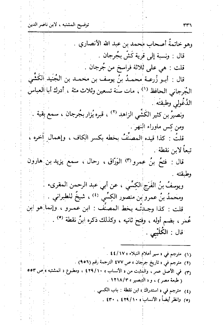 وَهُوَ خَاتِمَة أَصْحَاب مُحَمَّد بن عبد الله الْأنْصَارِيّ. قَالَ: وَنسبَة إِلَى قَرْيَة كش بجرجان. قلت: هِيَ على ثَلَاثَة فراسخ من جرجان. قَالَ: أَبُو زرْعَة مُحَمَّد بن يُوسُف بن مُحَمَّد بن الْجُنَيْد الْكشِّي الْجِرْجَانِيّ الْحَافِظ مَاتَ سنة تسعين وَثَلَاث مئة أدْرك أَبَا الْعَبَّاس الدغولي وطبقته. ونصير بن كثير الْكشِّي الزَّاهِد قَبره يزار بجرجان سمع بَقِيَّة. وَمن كس مَا وَرَاء النَّهر. قلت: كَذَا قَيده المُصَنّف بِخَطِّهِ بِكَسْر الْكَاف وإهمال آخِره تبعا لِابْنِ نقطة. قَالَ: فتح بن عَمْرو الْوراق رحال سمع يزِيد بن هَارُون وطبقته. ويوسف بن الْفرج الكسي عَن أبي عبد الرَّحْمَن الْمُقْرِئ. وَمُحَمّد بن عَمْرو بن مَنْصُور الكسي شيخ للطبراني. قلت: كَذَا وجدته بِخَط المُصَنّف: ابْن عَمْرو وَإِنَّمَا هُوَ ابْن عمر بِضَم أَوله وَفتح ثَانِيه وَكَذَلِكَ ذكره ابْن نقطة. قَالَ: الكليبي.