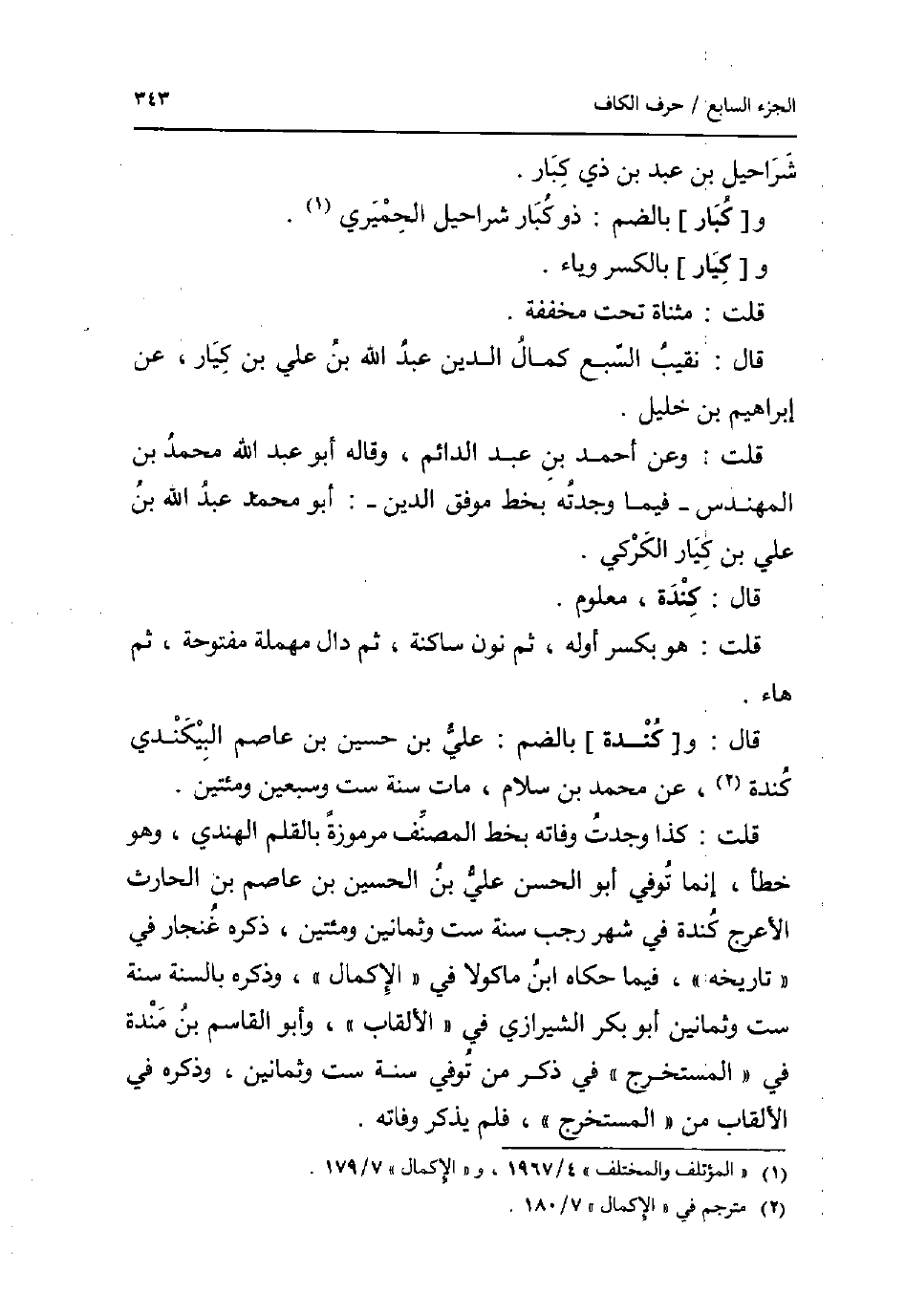 شرَاحِيل بن عبد بن ذِي كبار. و [كبار] بِالضَّمِّ: ذُو كبار شرَاحِيل الْحِمْيَرِي. و [كيار] بِالْكَسْرِ وياء. قلت: مثناة تَحت مُخَفّفَة. قَالَ: نقيب السَّبع كَمَال الدّين عبد الله بن عَليّ بن كيار عَن إِبْرَاهِيم بن خَلِيل. قلت: وَعَن أَحْمد بن عبد الدَّائِم وَقَالَهُ أَبُو عبد الله مُحَمَّد بن المهندس _ فِيمَا وجدته بِخَط موفق الدّين _: أَبُو مُحَمَّد عبد الله بن عَليّ بن كيار الكركي. قَالَ: كِنْدَة مَعْلُوم. قلت: هُوَ بِكَسْر أَوله ثمَّ نون سَاكِنة ثمَّ دَال مُهْملَة مَفْتُوحَة ثمَّ هَاء. قَالَ: و [كِنْدَة] بِالضَّمِّ: عَليّ بن حُسَيْن بن عَاصِم البيكندي كِنْدَة عَن مُحَمَّد بن سَلام مَاتَ سنة سِتّ وَسبعين ومئتين. قلت: كَذَا وجدت وَفَاته بِخَط المُصَنّف مرموزة بالقلم الْهِنْدِيّ وَهُوَ خطأ إِنَّمَا توفّي أَبُو الْحسن عَليّ بن الْحُسَيْن بن عَاصِم بن الْحَارِث الْأَعْرَج كِنْدَة فِي شهر رَجَب سنة سِتّ وَثَمَانِينَ ومئتين ذكره غُنْجَار فِي تَارِيخه فِيمَا حَكَاهُ ابْن مَاكُولَا فِي الْإِكْمَال وَذكره بِالسنةِ سنة سِتّ وَثَمَانِينَ أَبُو بكر الشِّيرَازِيّ فِي الألقاب وَأَبُو الْقَاسِم بن مندة فِي الْمُسْتَخْرج فِي ذكر من توفّي سنة سِتّ وَثَمَانِينَ وَذكره فِي الألقاب من الْمُسْتَخْرج فَلم يذكر وَفَاته.
