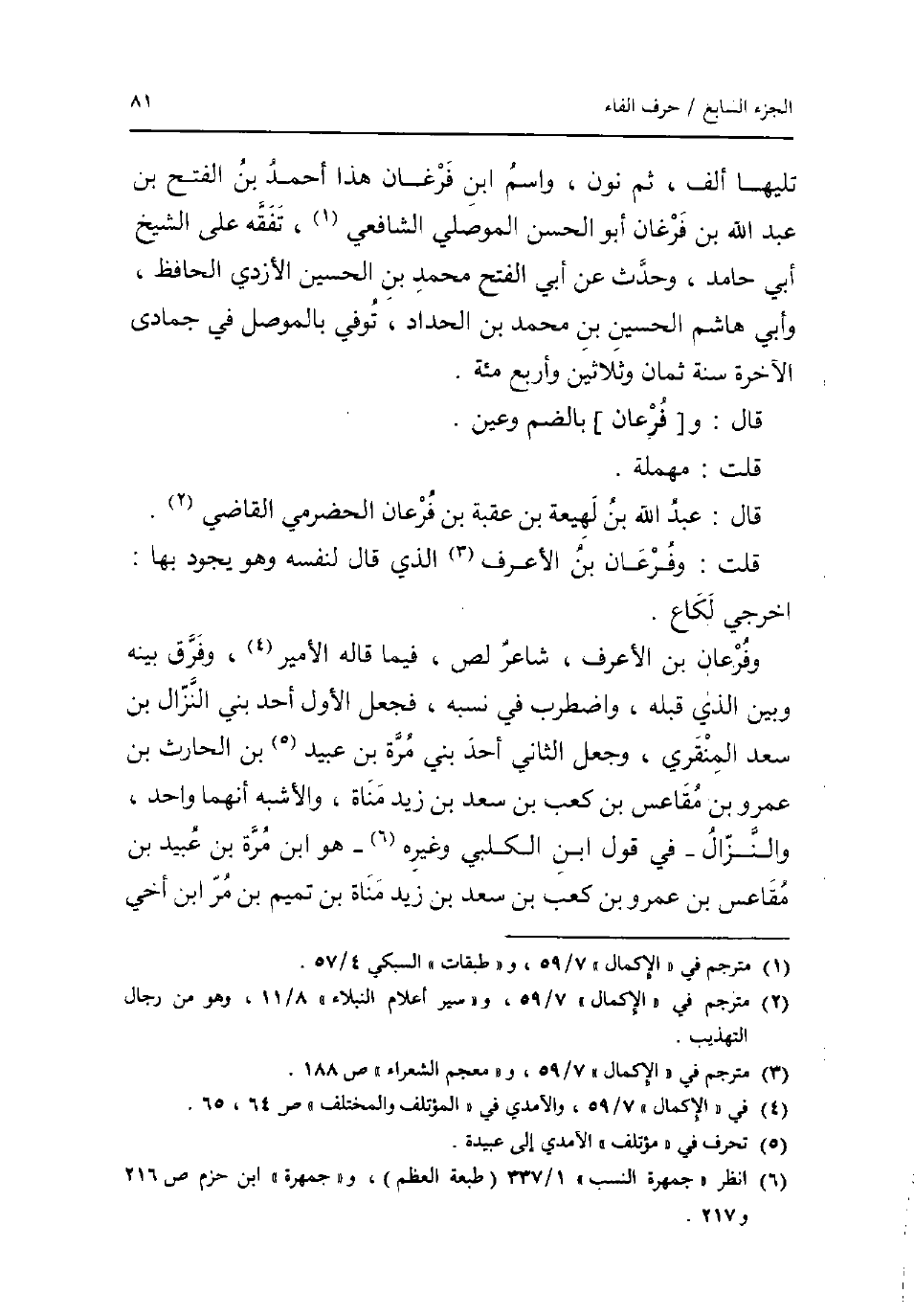 تَلِيهَا ألف ثمَّ نون وَاسم ابْن فرغان هَذَا أَحْمد بن الْفَتْح بن عبد الله بن فرغان أَبُو الْحسن الْموصِلِي الشَّافِعِي تفقه على الشَّيْخ أبي حَامِد وَحدث عَن أبي الْفَتْح مُحَمَّد بن الْحُسَيْن الْأَزْدِيّ الْحَافِظ وَأبي هَاشم الْحُسَيْن بن مُحَمَّد بن الْحداد توفّي بالموصل فِي جُمَادَى الْآخِرَة سنة ثَمَان وَثَلَاثِينَ وَأَرْبع مئة. قَالَ: و [فرعان] بِالضَّمِّ وَعين. قلت: مُهْملَة. قَالَ: عبد الله بن لَهِيعَة بن عقبَة بن فرعان الْحَضْرَمِيّ القَاضِي. قلت: وفرعان بن الأعرف الَّذِي قَالَ لنَفسِهِ وَهُوَ يجود بهَا: اخْرُجِي لكاع. وفرعان بن الأعرف شَاعِر لص فِيمَا قَالَه الْأَمِير وَفرق بَينه وَبَين الَّذِي قبله واضطرب فِي نسبه فَجعل الأول أحد بني النزال بن سعد الْمنْقري وَجعل الثَّانِي أحد بني مرّة بن عبيد بن الْحَارِث بن عَمْرو بن مقاعس بن كَعْب بن سعد بن زيد مَنَاة وَالْأَشْبَه أَنَّهُمَا وَاحِد والنزال _ فِي قَول ابْن الْكَلْبِيّ وَغَيره _ هُوَ ابْن مرّة بن عبيد بن مقاعس بن عَمْرو بن كَعْب بن سعد بن زيد مَنَاة بن تَمِيم بن مر ابْن أخي