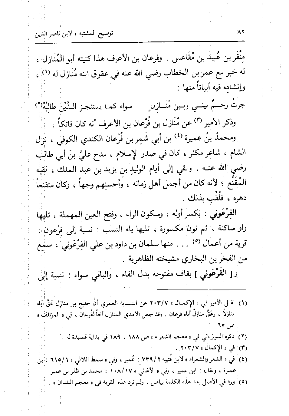 وَذكر الْأَمِير عَن منَازِل بن فرعان بن الأعرف أَنه كَانَ فاتكا. وَمُحَمّد بن عميرَة بن أبي شمر بن فرعان الْكِنْدِيّ الْكُوفِي نزل الشَّام شَاعِر مكثر كَانَ فِي صدر الْإِسْلَام مدح عَليّ بن أبي طَالب رَضِي الله عَنهُ وَبَقِي إِلَى أَيَّام الْوَلِيد بن يزِيد بن عبد الْملك لقبه الْمقنع؛ لِأَنَّهُ كَانَ من أجمل أهل زَمَانه وَأَحْسَنهمْ وَجها وَكَانَ متقنعا دهره فلقب بذلك. الفرعوني: بِكَسْر أَوله وَسُكُون الرَّاء وَفتح الْعين الْمُهْملَة تَلِيهَا وَاو سَاكِنة ثمَّ نون مَكْسُورَة تَلِيهَا يَاء النّسَب: نِسْبَة إِلَى فِرْعَوْن: قَرْيَة من أَعمال ... مِنْهَا سلمَان بن دَاوُد بن عَليّ الفرعوني سمع من الْفَخر بن البُخَارِيّ مشيخته الظَّاهِرِيَّة. و [القرعوني] بقاف مَفْتُوحَة بدل الْفَاء وَالْبَاقِي سَوَاء: نِسْبَة إِلَى