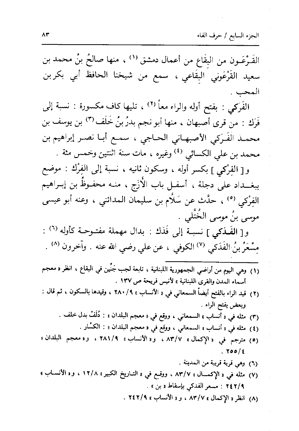 الفرعون من الْبِقَاع من أَعمال دمشق مِنْهَا صَالح بن مُحَمَّد بن سعيد القرعوني البقاعي سمع من شَيخنَا الْحَافِظ أبي بكر بن الْمُحب. الفركي: بِفَتْح أَوله وَالرَّاء مَعًا تَلِيهَا كَاف مَكْسُورَة نِسْبَة إِلَى فرك: من قرى أَصْبَهَان مِنْهَا أَبُو نجم بدر بن خلف بن يُوسُف بن مُحَمَّد الفركي الْأَصْبَهَانِيّ الحاجي سمع أَبَا نصر إِبْرَاهِيم بن مُحَمَّد بن عَليّ الْكسَائي وَغَيره مَاتَ سنة اثْنَتَيْنِ وَخمْس مئة. و [الفركي] بِكَسْر أَوله وَسُكُون ثَانِيه نِسْبَة إِلَى الفرك: مَوضِع بِبَغْدَاد على دجلة أَسْفَل بَاب الأزج مِنْهُ مَحْفُوظ بن إِبْرَاهِيم الفركي حدث عَن سَلام بن سُلَيْمَان الْمَدَائِنِي وَعنهُ أَبُو عِيسَى مُوسَى بن مُوسَى الْخُتلِي. و [الفدكي] نِسْبَة إِلَى فدك: بدال مُهْملَة مَفْتُوحَة كأوله: مسعر بن الفدكي الْكُوفِي عَن عَليّ رَضِي الله عَنهُ. وَآخَرُونَ.