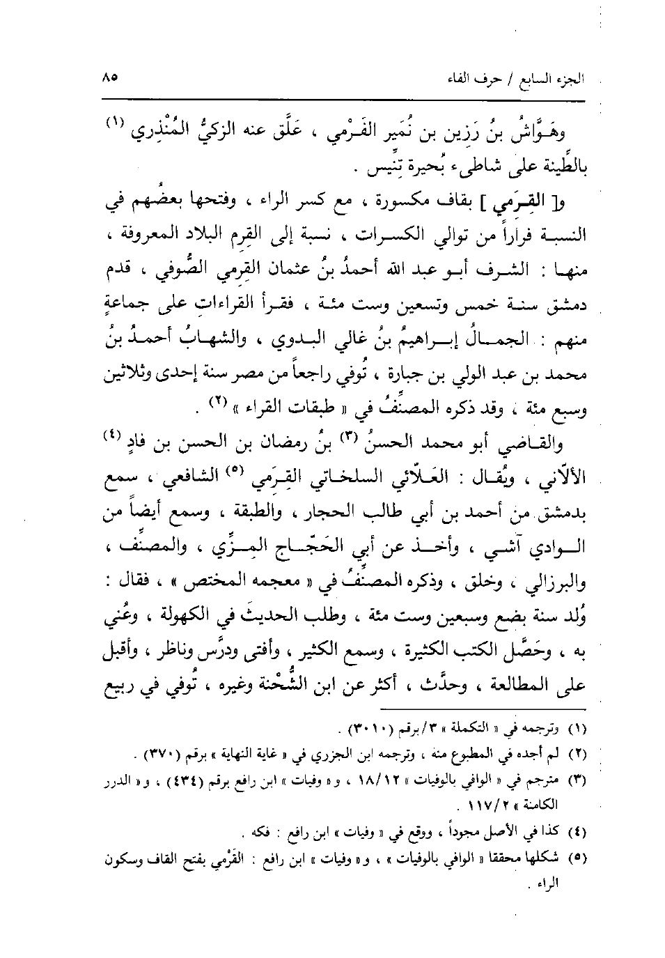 وهواش بن رزين بن نمير الفرمي علق عَنهُ الزكي الْمُنْذِرِيّ بالطينة على شاطئ بحيرة تنيس. و [القرمي] بقاف مَكْسُورَة مَعَ كسر الرَّاء وَفتحهَا بَعضهم فِي النِّسْبَة فِرَارًا من توالي الكسرات نِسْبَة إِلَى القرم الْبِلَاد الْمَعْرُوفَة مِنْهَا: الشّرف أَبُو عبد الله أَحْمد بن عُثْمَان القرمي الصُّوفِي قدم دمشق سنة خمس وَتِسْعين وست مئة فَقَرَأَ الْقرَاءَات على جمَاعَة مِنْهُم: الْجمال إِبْرَاهِيم بن غالي البدوي والشهاب أَحْمد بن مُحَمَّد بن عبد الْوَلِيّ بن جبارَة توفّي رَاجعا من مصر سنة إِحْدَى وَثَلَاثِينَ وَسبع مئة وَقد ذكره المُصَنّف فِي طَبَقَات الْقُرَّاء. وَالْقَاضِي أَبُو مُحَمَّد الْحسن بن رَمَضَان بن الْحسن بن فاد الألاني وَيُقَال: العلائي السلخاتي القرمي الشَّافِعِي سمع بِدِمَشْق من أَحْمد بن أبي طَالب الحجار والطبقة وَسمع أَيْضا من الْوَادي آشي وَأخذ عَن أبي الْحجَّاج الْمزي وَالْمُصَنّف والبرزالي وَخلق وَذكره المُصَنّف فِي مُعْجَمه الْمُخْتَص فَقَالَ: ولد سنة بضع وَسبعين وست مئة وَطلب الحَدِيث فِي الكهولة وغني بِهِ وَحصل الْكتب الْكَثِيرَة وَسمع الْكثير وَأفْتى ودرس وناظر وَأَقْبل على المطالعة وَحدث أَكثر عَن ابْن الشّحْنَة وَغَيره توفّي فِي ربيع