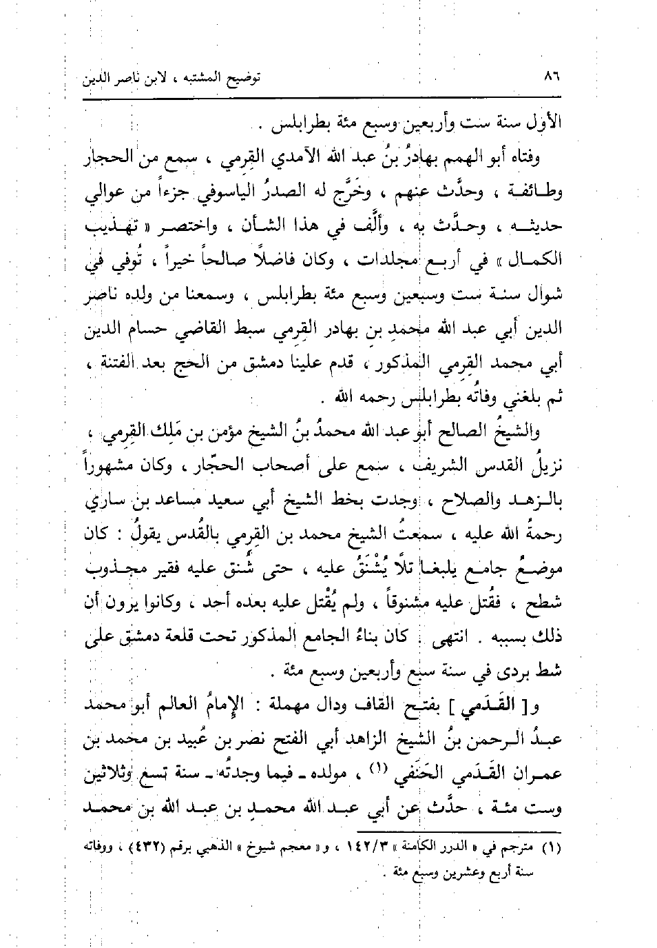 الأول سنة سِتّ وَأَرْبَعين وَسبع مئة بطرابلس. وفتاه أَبُو الهمم بهادر بن عبد الله الْآمِدِيّ القرمي سمع من الحجار وَطَائِفَة وَحدث عَنْهُم وَخرج لَهُ الصَّدْر الياسوفي جُزْءا من عوالي حَدِيثه وَحدث بِهِ وَألف فِي هَذَا الشَّأْن وَاخْتصرَ تَهْذِيب الْكَمَال فِي أَربع مجلدات وَكَانَ فَاضلا صَالحا خيرا توفّي فِي شَوَّال سنة سِتّ وَسبعين وَسبع مئة بطرابلس وَسَمعنَا من وَلَده نَاصِر الدّين أبي عبد الله مُحَمَّد بن بهادر القرمي سبط القَاضِي حسام الدّين أبي مُحَمَّد القرمي الْمَذْكُور قدم علينا دمشق من الْحَج بعد الْفِتْنَة ثمَّ بَلغنِي وَفَاته بطرابلس رَحمَه الله. وَالشَّيْخ الصَّالح أَبُو عبد الله مُحَمَّد بن الشَّيْخ مُؤمن بن ملك القرمي نزيل الْقُدس الشريف سمع على أَصْحَاب الحجار وَكَانَ مَشْهُورا بالزهد وَالصَّلَاح وجدت بِخَط الشَّيْخ أبي سعيد مساعد بن ساري رَحْمَة الله عَلَيْهِ سَمِعت الشَّيْخ مُحَمَّد بن القرمي بالقدس يَقُول: كَانَ مَوضِع جَامع يلبغا تَلا يشنق عَلَيْهِ حَتَّى شنق عَلَيْهِ فَقير مجذوب شطح فَقتل عَلَيْهِ مشنوقا وَلم يقتل عَلَيْهِ بعده أحد وَكَانُوا يرَوْنَ ان ذَلِك بِسَبَبِهِ. انْتهى. كَانَ بِنَاء الْجَامِع الْمَذْكُور تَحت قلعة دمشق على شط بردى فِي سنة سبع وَأَرْبَعين وَسبع مئة. و [القدمي] بِفَتْح الْقَاف ودال مُهْملَة: الإِمَام الْعَالم أَبُو مُحَمَّد عبد الرَّحْمَن بن الشَّيْخ الزَّاهِد أبي الْفَتْح نصر بن عبيد بن مُحَمَّد بن عمرَان القدمي الْحَنَفِيّ مولده _ فِيمَا وجدته _ سنة تسع وَثَلَاثِينَ وست مئة حدث عَن أبي عبد الله مُحَمَّد بن عبد الله بن مُحَمَّد
