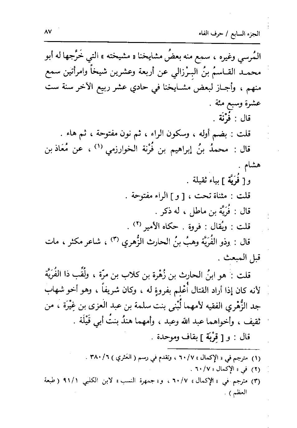 المرسي وَغَيره سمع مِنْهُ بعض مَشَايِخنَا مشيخته الَّتِي خرجها لَهُ أَبُو مُحَمَّد الْقَاسِم بن البرزالي عَن أَرْبَعَة وَعشْرين شَيخا وَامْرَأَتَيْنِ سمع مِنْهُم وَأَجَازَ لبَعض مَشَايِخنَا فِي حادي عشر ربيع الآخر سنة سِتّ عشرَة وَسبع مئة. قَالَ: فرنة. قلت: بِضَم أَوله وَسُكُون الرَّاء ثمَّ نون مَفْتُوحَة ثمَّ هَاء. قَالَ: مُحَمَّد بن إِبْرَاهِيم بن فرنة الْخَوَارِزْمِيّ عَن معَاذ بن هِشَام. و [فِرْيَة] بياء ثَقيلَة. قلت: مثناة تَحت [و] الرَّاء مَفْتُوحَة. قَالَ: فِرْيَة بن ماطل لَهُ ذكر. قلت: وَيُقَال: فَرْوَة. حَكَاهُ الْأَمِير. قَالَ: وَذُو الْفِرْيَة وهب بن الْحَارِث الزُّهْرِيّ شَاعِر مكثر مَاتَ قبل المبعث. قلت: هُوَ ابْن الْحَارِث بن زهرَة بن كلاب بن مرّة ولقب ذَا الْفِرْيَة لِأَنَّهُ كَانَ إِذا أَرَادَ الْقِتَال أعلم بفروة لَهُ وَكَانَ شريفا وَهُوَ أَخُو شهَاب جد الزُّهْرِيّ الْفَقِيه لِأُمِّهِمَا لبنى بنت سَلمَة بن عبد الْعُزَّى بن غيرَة من ثَقِيف وأخواهما عبد الله وَعبد وأمهما هِنْد بنت أبي قيلة. قَالَ: و [قربَة] بقاف وموحدة.