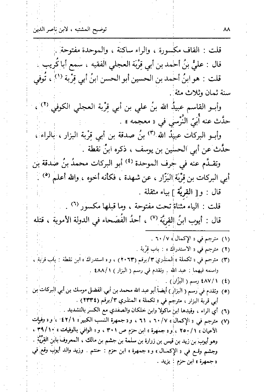 قلت: الْقَاف مَكْسُورَة وَالرَّاء سَاكِنة وَالْمُوَحَّدَة مَفْتُوحَة. قَالَ: عَليّ بن أَحْمد بن أبي قربَة الْعجلِيّ الْفَقِيه سمع أَبَا كريب. قلت: هُوَ ابْن أَحْمد بن الْحُسَيْن أَبُو الْحسن ابْن أبي قربَة توفّي سنة ثَمَان وَثَلَاث مئة. وَأَبُو الْقَاسِم عبيد الله بن عَليّ بن أبي قربَة الْعجلِيّ الْكُوفِي حدث عَنهُ أبي النَّرْسِي فِي مُعْجَمه. وَأَبُو البركات عبيد الله بن صَدَقَة بن أبي قربَة الْبَزَّار بالراء حدث عَن أبي الْحُسَيْن بن يُوسُف ذكره ابْن نقطة. وَتقدم عَنهُ فِي حرف الْمُوَحدَة أَبُو البركات مُحَمَّد بن صَدَقَة بن أبي البركات بن قربَة الْبَزَّار عَن شهدة فَكَأَنَّهُ أَخُوهُ وَالله أعلم. قَالَ: و [الْقرْيَة] بياء مثقلة. قلت: الْيَاء مثناة تَحت مَفْتُوحَة وَمَا قبلهَا مكسور. قَالَ: أَيُّوب ابْن الْقرْيَة أحد الفصحاء فِي الدولة الأموية قَتله