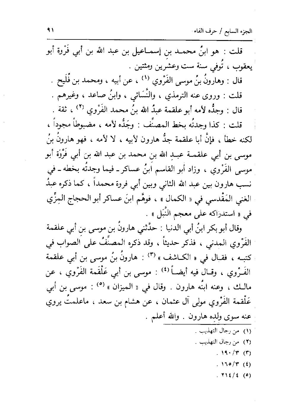 قلت: هُوَ ابْن مُحَمَّد بن إِسْمَاعِيل بن عبد الله بن أبي فَرْوَة أَبُو يَعْقُوب توفّي سنة سِتّ وَعشْرين ومئتين. قَالَ: وَهَارُون بن مُوسَى الْفَروِي عَن أَبِيه وَمُحَمّد بن فليح. قلت: وروى عَنهُ التِّرْمِذِيّ وَالنَّسَائِيّ وَابْن صاعد وَغَيرهم. قَالَ: وجده لأمه أَبُو عَلْقَمَة عبد الله بن مُحَمَّد الْفَروِي ثِقَة. قلت: كَذَا وجدته بِخَط المُصَنّف: وجده لأمه مضبوطا مجودا لكنه خطأ فَإِن أَبَا عَلْقَمَة جد هَارُون لِأَبِيهِ لَا لأمه فَهُوَ هَارُون بن مُوسَى بن أبي عَلْقَمَة عبد الله بن مُحَمَّد بن عبد الله بن أبي فَرْوَة أَبُو مُوسَى الْفَروِي وَزَاد أَبُو الْقَاسِم ابْن عَسَاكِر _ فِيمَا وجدته بِخَطِّهِ _ فِي نسب هَارُون بَين عبد الله الثَّانِي وَبَين أبي فَرْوَة مُحَمَّدًا كَمَا ذكره عبد الْغَنِيّ الْمَقْدِسِي فِي الْكَمَال فَوَهم ابْن عَسَاكِر أَبُو الْحجَّاج الْمزي فِي استدراكه على مُعْجم النبل. وَقَالَ أَبُو بكر ابْن أبي الدُّنْيَا: حَدثنِي هَارُون بن مُوسَى بن أبي عَلْقَمَة الْفَروِي الْمدنِي فَذكر حَدِيثا وَقد ذكره المُصَنّف على الصَّوَاب فِي كتبه فَقَالَ فِي الكاشف: هَارُون بن مُوسَى بن أبي عَلْقَمَة الْفَروِي وَقَالَ فِيهِ أَيْضا: مُوسَى بن عَلْقَمَة الْفَروِي عَن مَالك وَعنهُ ابْنه هَارُون. وَقَالَ فِي الْمِيزَان: مُوسَى بن أبي عَلْقَمَة الْفَروِي مولى آل عُثْمَان عَن هِشَام بن سعد مَا علمت يروي عَنهُ سوى وَلَده هَارُون. وَالله أعلم.