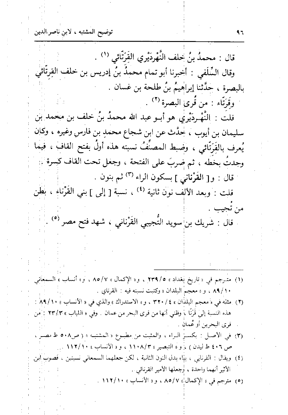 قَالَ: مُحَمَّد بن خلف النهرديري القرتائي. وَقَالَ السلَفِي: أخبرنَا أَبُو تَمام مُحَمَّد بن إِدْرِيس بن خلف القرتائي بِالْبَصْرَةِ حَدثنَا إِبْرَاهِيم بن طَلْحَة بن غَسَّان. وقرتاء: من قرى الْبَصْرَة. قلت: النهرديري هُوَ أَبُو عبد الله مُحَمَّد بن خلف بن مُحَمَّد بن سُلَيْمَان بن أَيُّوب حدث عَن ابْن شُجَاع مُحَمَّد بن فَارس وَغَيره وَكَانَ يعرف بالقرتائي وَضبط المُصَنّف نسبته هَذِه أول بِفَتْح الْقَاف فِيمَا وجدت بِخَطِّهِ ثمَّ ضرب على الفتحة وَجعل تَحت الْقَاف كسرة. قَالَ: و [القرناني] بِسُكُون الرَّاء ثمَّ نون. قلت: وَبعد الْألف نون ثَانِيَة نِسْبَة [إِلَى] بني القرناء بطن من تجيب. قَالَ: شريك بن سُوَيْد التجِيبِي القرناني شهد فتح مصر.