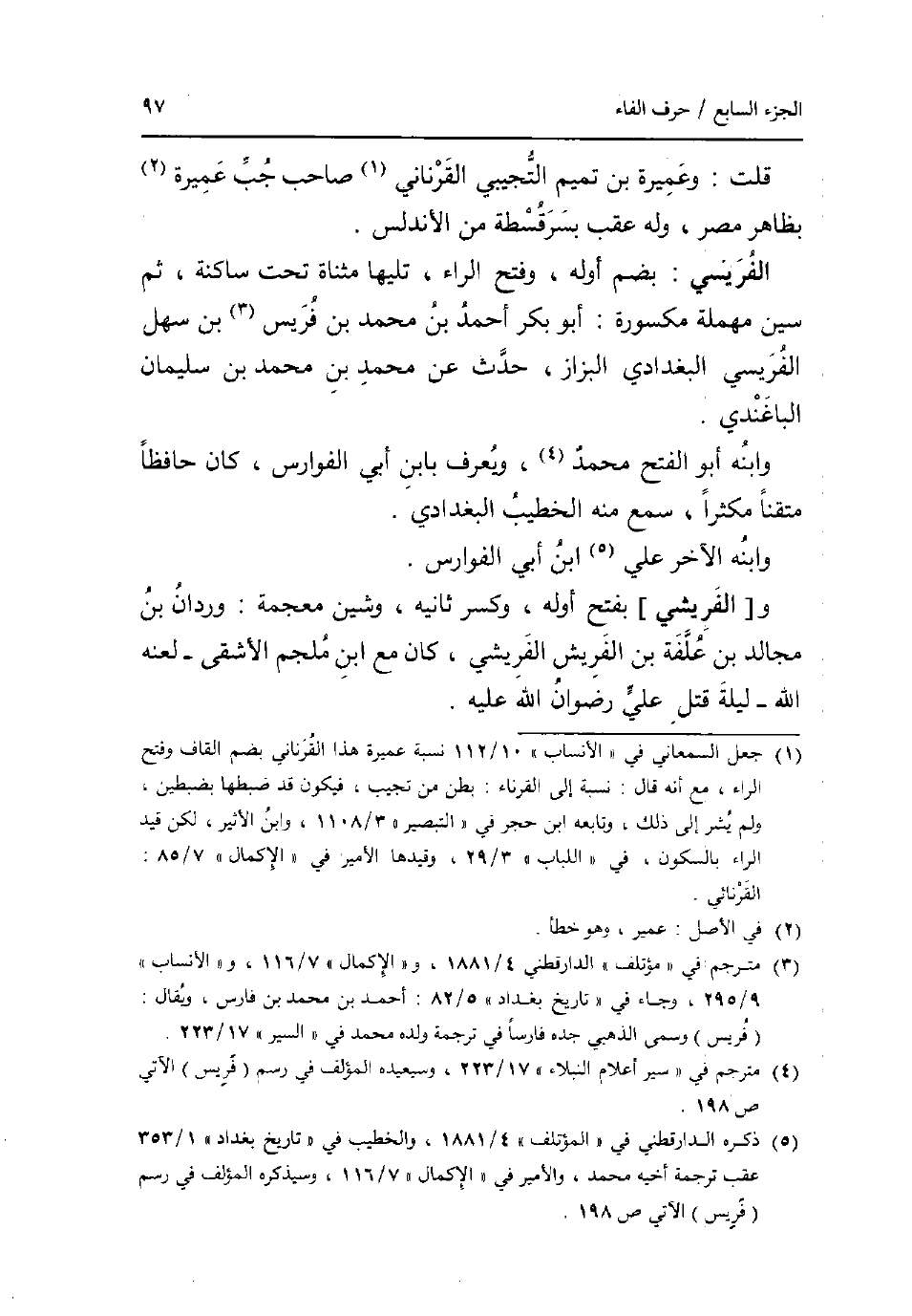 قلت: وعميرة بن تَمِيم التجِيبِي القرناني صَاحب جب عميرَة بِظَاهِر مصر وَله عقب بسرقسطة من الأندلس. الفريسي: بِضَم أَوله وَفتح الرَّاء تَلِيهَا مثناة تَحت سَاكِنة ثمَّ سين مُهْملَة مَكْسُورَة: أَبُو بكر أَحْمد بن مُحَمَّد بن فريس بن سهل الفريسي الْبَغْدَادِيّ الْبَزَّاز حدث عَن مُحَمَّد بن مُحَمَّد بن سُلَيْمَان الباغندي. وَابْنه أَبُو الْفَتْح مُحَمَّد وَيعرف بِابْن أبي الفوارس كَانَ حَافِظًا متقنا مكثرا سمع مِنْهُ الْخَطِيب الْبَغْدَادِيّ. وَابْنه الآخر عَليّ ابْن أبي الفوارس. و [الفريشي] بِفَتْح أَوله وَكسر ثَانِيه وشين مُعْجمَة: وردان بن مجَالد بن علفة بن الفريش الفريشي كَانَ مَعَ ابْن ملجم الأشقى _ لَعنه الله _ لَيْلَة قتل عَليّ رضوَان الله عَلَيْهِ.