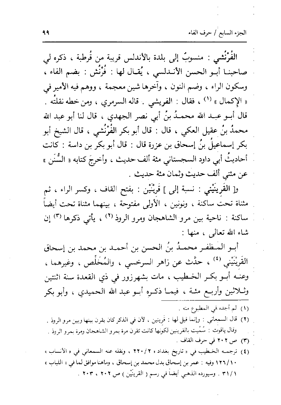 الفرنشي: مَنْسُوب إِلَى بَلْدَة بالأندلس قريبَة من قرطبة ذكره لي صاحبنا أَبُو الْحسن الأندلسي يُقَال لَهَا: فرنش: بِضَم الْفَاء وَسُكُون الرَّاء وَضم النُّون وَآخِرهَا شين مُعْجمَة وَوهم فِيهِ الْأَمِير فِي الْإِكْمَال فَقَالَ: الفريشي. قَالَه السرمري وَمن خطه نقلته. قَالَ أَبُو عبد الله مُحَمَّد بن أبي نصر الجهدي قَالَ لنا أَبُو عبد الله مُحَمَّد بن عقيل العكي قَالَ: قَالَ أَبُو بكر الفرنشي قَالَ الشَّيْخ أَبُو بكر إِسْمَاعِيل بن إِسْحَاق بن عزْرَة قَالَ: قَالَ أَبُو بكر بن داسة: كَانَت أَحَادِيث أبي دَاوُد السجسْتانِي مئة ألف حَدِيث وَأخرج كِتَابه السّنَن عَن مئتي ألف حَدِيث وثمان مئة حَدِيث. و [القرينيني: نِسْبَة إِلَى] قرينين: بِفَتْح الْقَاف وَكسر الرَّاء ثمَّ مثناة تَحت سَاكِنة ونونين الأولى مَفْتُوحَة بَينهمَا مثناة تَحت أَيْضا سَاكِنة: نَاحيَة بَين مرو الشاهجان ومرو الروذ يَأْتِي ذكرهَا إِن شَاءَ الله تَعَالَى مِنْهَا: أَبُو المظفر مُحَمَّد بن الْحسن بن أَحْمد بن مُحَمَّد بن إِسْحَاق القرينيني حدث عَن زَاهِر السَّرخسِيّ والمخلص وَغَيرهمَا وَعنهُ أَبُو بكر الْخَطِيب مَاتَ بشهرزور فِي ذِي الْقعدَة سنة اثْنَتَيْنِ وَثَلَاثِينَ وَأَرْبع مئة فِيمَا ذكره أَبُو عبد الله الْحميدِي وَأَبُو بكر