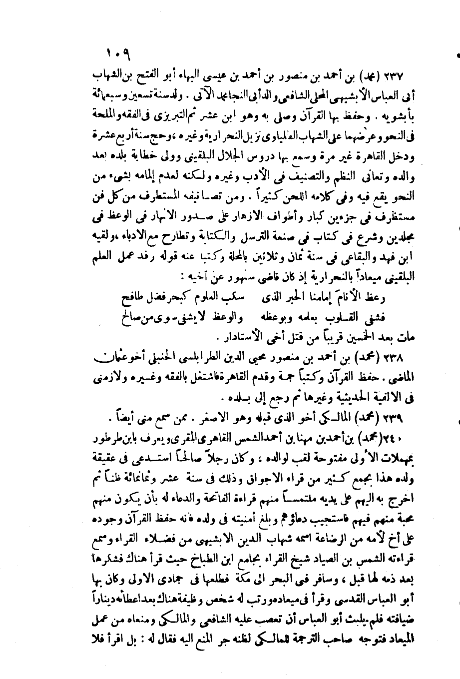 وعرضهما على الشهَاب الطلياوي نزيل النحرارية وَغَيره، وَحج سنة أَربع عشرَة وَدخل الْقَاهِرَة غير مرّة وَسمع بهَا دروس الْجلَال البُلْقِينِيّ وَولي خطابة بَلَده بعد وَالِده وتعانى النّظم والتصنيف فِي الْأَدَب وَغَيره وَلكنه لعدم إلمامه بِشَيْء من النَّحْو يَقع فِيهِ وَفِي كَلَامه اللّحن كثيرا. وَمن تصانيفه المستطرف من كل فن مستظرف فِي جزءان كبار وأطواف الأزهار على صُدُور الْأَنْهَار فِي الْوَعْظ فِي مجلدين وَشرع فِي كتاب فِي صَنْعَة الترسل وَالْكِتَابَة وتطارح مَعَ الأدباء، ولقيه ابْن فَهد والبقاعي فِي سنة ثَمَان وَثَلَاثِينَ بالمحلة وكتبا عَنهُ قَوْله وَقد عمل الْعلم البُلْقِينِيّ ميعادا بالنحرارية إِذْ كَانَ قَاضِي سنهور عَن أَخِيه: