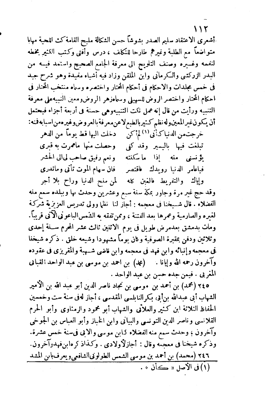 وَقد حج غير مرّة وجاور بِمَكَّة سنة سبع وَعشْرين وَحدث بهَا وببلده سمع مِنْهُ الْفُضَلَاء. قَالَ شَيخنَا فِي مُعْجَمه: أجَاز لنا نظما وَولي تدريس العزيزية شركَة لغيره والصارمية وعمرها بعد الْفِتْنَة، وَمِمَّنْ تفقه بِهِ الشَّمْس الباعوني الْآتِي قَرِيبا. وَمَات بِدِمَشْق بعد مرض طَوِيل فِي يَوْم الْإِثْنَيْنِ ثَالِث عشر الْمحرم سنة إِحْدَى وَثَلَاثِينَ وَدفن بمقبرة الصُّوفِيَّة وَكَانَ يَوْمًا مشهودا وشيعه خلق. ذكره شَيخنَا فِي مُعْجَمه وإنبائه وَابْن فَهد فِي مُعْجَمه وَابْن قَاضِي شُهْبَة والمقريزي فِي عقوده وَآخَرُونَ رَحمَه الله وإيانا. مُحَمَّد بن أَحْمد بن مُوسَى بن عبد الْوَاحِد القباني المغربي. فِيمَن جده حسن بن عبد الْوَاحِد.