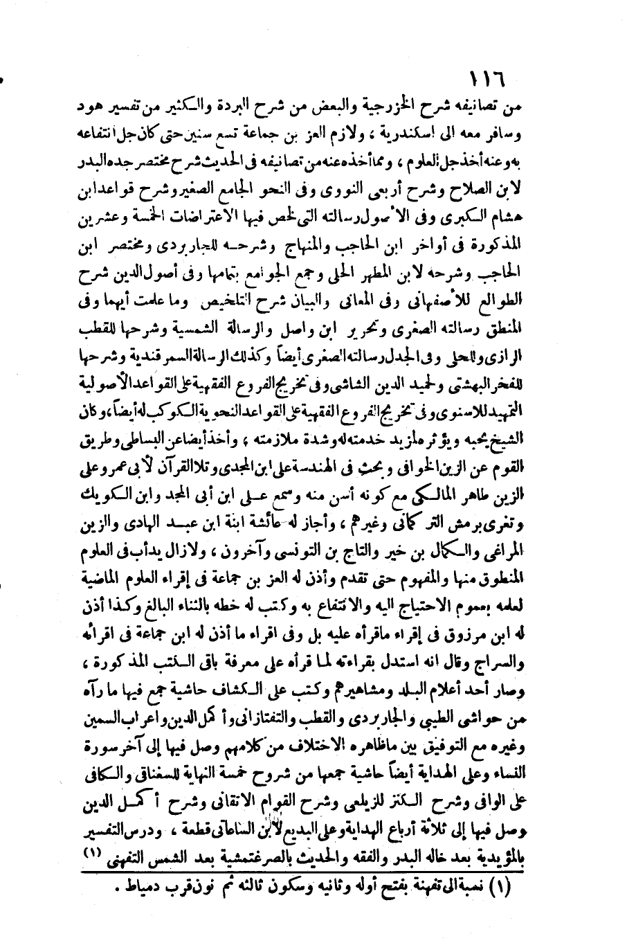 الِاحْتِيَاج إِلَيْهِ وَالِانْتِفَاع بِهِ وَكتب لَهُ خطه بالثناء الْبَالِغ وَكَذَا أَن لَهُ ابْن مَرْزُوق فِي إقراء مَا قراه عَلَيْهِ بل وَفِي اقراء مَا اذن لَهُ ابْن جمَاعَة فِي إقرائه والسراج وَقَالَ أَنه اسْتدلَّ بقرَاءَته لما قَرَأَهُ على معرفَة بَاقِي الْكتب الْمَذْكُورَة، وَصَارَ أحد أَعْلَام الْبَلَد ومشاهيرهم وَكتب على الْكَشَّاف حَاشِيَة جمع فِيهَا مَا رَآهُ من حَوَاشِي الطَّيِّبِيّ وَالْجَار بردى والقطب والتفتازاني وأكمل الدّين وإعراب السمين وَغَيره مَعَ التَّوْفِيق بَين مَا ظَاهره الِاخْتِلَاف من كَلَامهم وصل فِيهَا إِلَى آخر سُورَة النِّسَاء وعَلى الْهِدَايَة أَيْضا حَاشِيَة جمعهَا من شُرُوح خَمْسَة النِّهَايَة للسغناقي وَالْكَافِي على الوافي وَشرح الْكَنْز للزيلعي وَشرح القوام الإتقاني وَشرح أكمل الدّين وصل فِيهَا إِلَى ثَلَاثَة أَربَاع الْهِدَايَة وعَلى البديع لِابْنِ الساعاتي قِطْعَة، ودرس التَّفْسِير بالمؤيدية بعد خَاله الْبَدْر وَالْفِقْه والْحَدِيث بالصر غتمشية بعد الشَّمْس التفهني