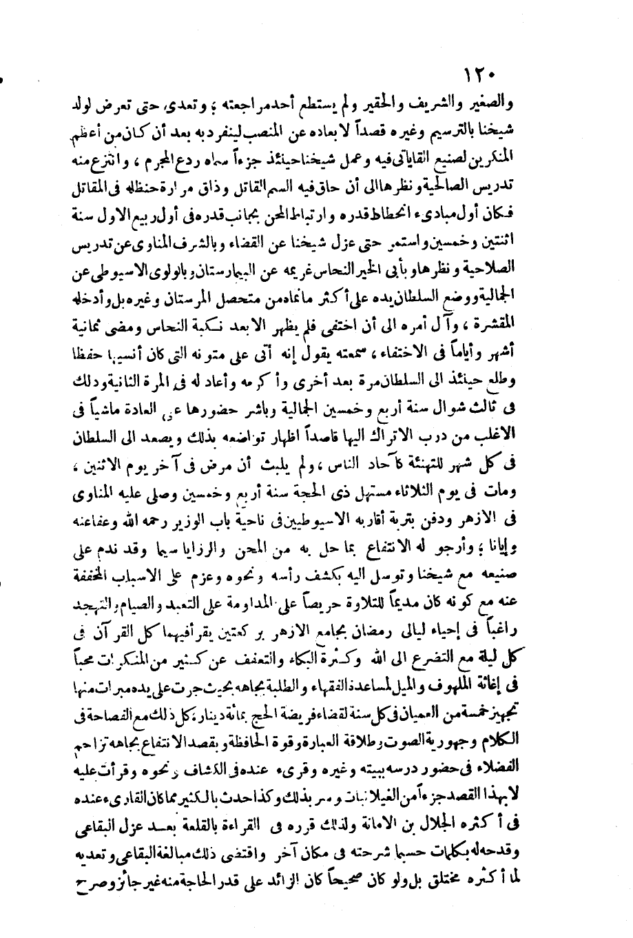 الجمالية وباشر حُضُورهَا على الْعَادة مَاشِيا فِي الْأَغْلَب من درب الأتراك إِلَيْهَا قَاصِدا تواضعه بذلك ويصعد إِلَى السُّلْطَان فِي كلك شهر للتهنئة كآحاد النَّاس، وَلم يلبث أَن مرض فِي آخر يَوْم الِاثْنَيْنِ، وَمَات فِي يَوْم الثُّلَاثَاء مستهل ذِي الْحجَّة سنة أَربع وَخمسين وَصلى عَلَيْهِ الْمَنَاوِيّ فِي الْأَزْهَر وَدفن بتربة أَقَاربه الاسيوطيين فِي نَاحيَة بَاب الْوَزير رَحمَه الله عَفا عَنهُ وأيانا وَأَرْجُو لَهُ الِانْتِفَاع بِمَا حل بِهِ من المحن والرزايا سِيمَا وَقد نَدم على صَنِيعه مَعَ شَيخنَا وتوسل إِلَيْهِ بكشف رَأسه وَنَحْوه وعزم على الْأَسْبَاب المخففة عَنهُ مَعَ كَونه كَانَ مديما للتلاوة حَرِيصًا على المداومة على التَّعَبُّد وَالصِّيَام والتجهد رَاغِبًا فِي إحْيَاء ليَالِي رَمَضَان بِجَامِع الْأَزْهَر بِرَكْعَتَيْنِ يقْرَأ فيهمَا كل الْقُرْآن فِي كل لَيْلَة مَعَ التضرع إِلَى الله وَكَثْرَة الْبكاء وَالتَّعَفُّف عَن كثير من الْمُنْكَرَات محبا فِي إغاثة الملهوف والميل لمساعدة الْفُقَهَاء والطلبة وبجاهه بِحَيْثُ جرت على يَده مبرات مِنْهَا تجهيز خمس من العميان فِي كل سنة لقَضَاء فَرِيضَة الْحَج بِمِائَة دِينَار، كل ذَلِك مَعَ الفصاحة فِي الْكَلَام وجهورية الصَّوْت وطلاقة الْعبارَة وَقُوَّة الحافظة وبقصد الِانْتِفَاع بجاهه تزاحم الْفُضَلَاء فِي حُضُور درسه ببيته وَغَيره وَقَرَأَ عِنْده فِي الْكَشَّاف وَنَحْوه وقرأت عَلَيْهِ لَا بِهَذَا الْقَصْد جُزْءا من الغيلا نَبَات وسر بذلك وَكَذَا حدث بالكثير مِمَّا كَانَ الْقَارئ عِنْده فِي أَكْثَره الْجلَال بن الْأَمَانَة وَلذَلِك قَرَّرَهُ فِي الْقِرَاءَة بالقلعة بعد عزل البقاعي وقدحه بِكَلِمَات حَسْبَمَا شرحته فِي مَكَان آخر وَاقْتضى ذَلِك مُبَالغَة البقاعي وتعديه لما أَكْثَره مختلق بل وَلَو كَانَ صَحِيحا كَانَ الزَّائِد على الْقدر الْحَاجة مِنْهُ غير جَائِز وَصرح