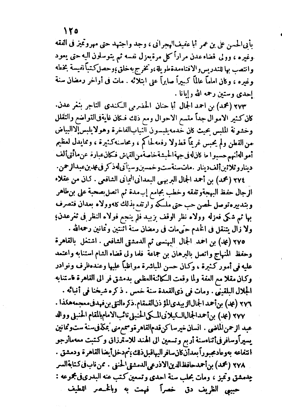 بِأبي الْحسن على بن عمر أباعفيف الهجراني، وجد واجتهد حَتَّى مهر وتميز فِي الْفِقْه وَغَيره، وَولي قَضَاء عدن مرَارًا كل مرّة يعْزل نَفسه ثمَّ يتوسلون إِلَيْهِ حَتَّى يعود وانتصب بهَا للتدريس والإفتاء مُدَّة طَوِيلَة، وَتخرج بِهِ خلق وَحصل كتبا نفيسة بِخَطِّهِ وَغَيره، وَكَانَ إِمَامًا عَالما كَبِيرا صَابِرًا على ابتلائه. مَاتَ فِي أَوَاخِر رَمَضَان سنة إِحْدَى وَسِتِّينَ رَحمَه الله وإيانا.