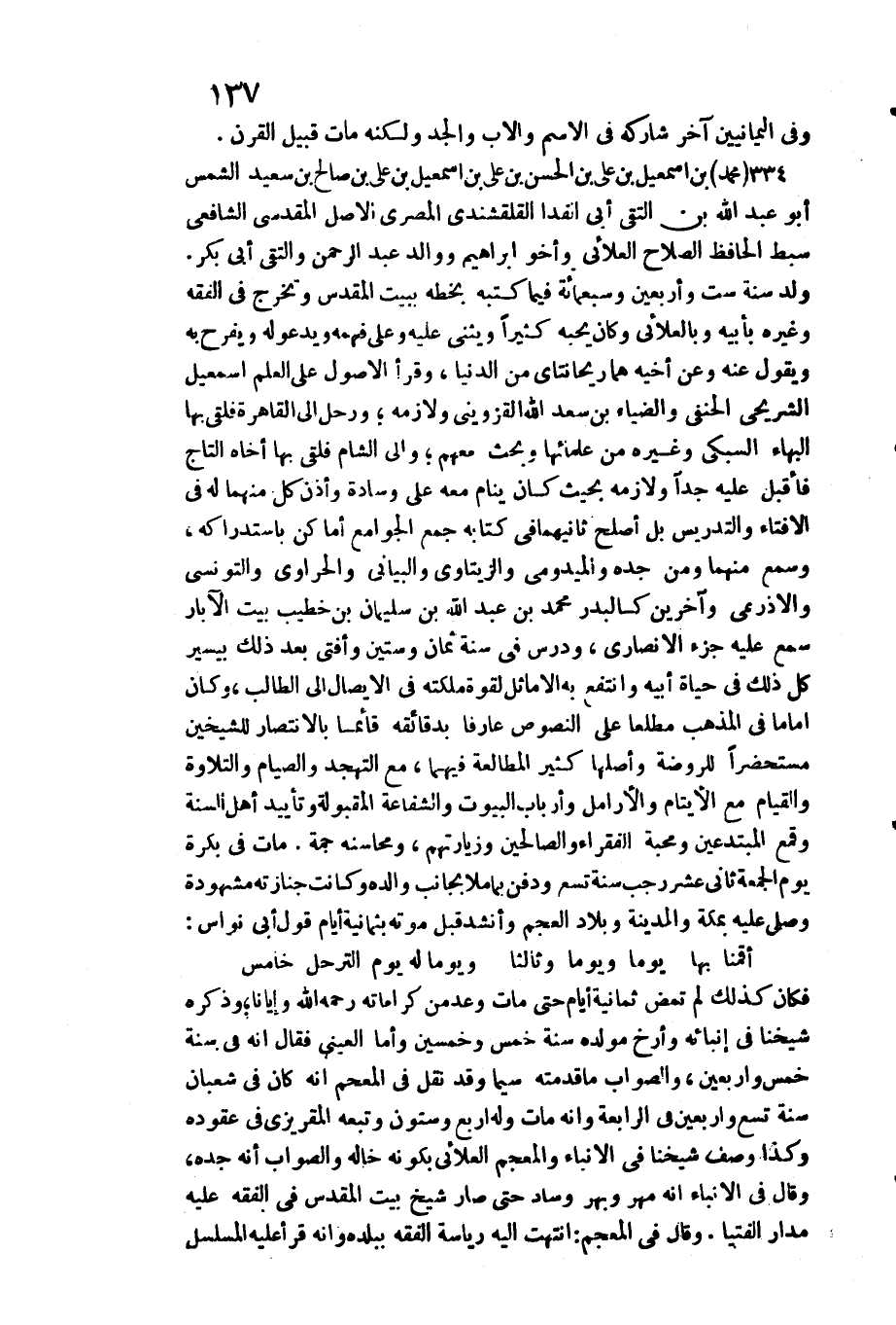 الرَّابِعَة وَأَنه مَاتَ وَله أَربع وَسِتُّونَ وَتَبعهُ المقريزي فِي عقوده وَكَذَا وصف شَيخنَا فِي الأنباء والمعجم العلائي بِكَوْنِهِ خَاله وَالصَّوَاب أَنه جده، وَقَالَ فِي الأنباء أَنه مهر وبهر وساد حَتَّى صَار شيخ بَيت الْمَقْدِسِي فِي الْفِقْه عَلَيْهِ مدَار الْفتيا. وَقَالَ فِي المعجم: انْتَهَت إِلَيْهِ رياسة الْفِقْه بِبَلَدِهِ وَأَنه قَرَأَ عَلَيْهِ المسلسل