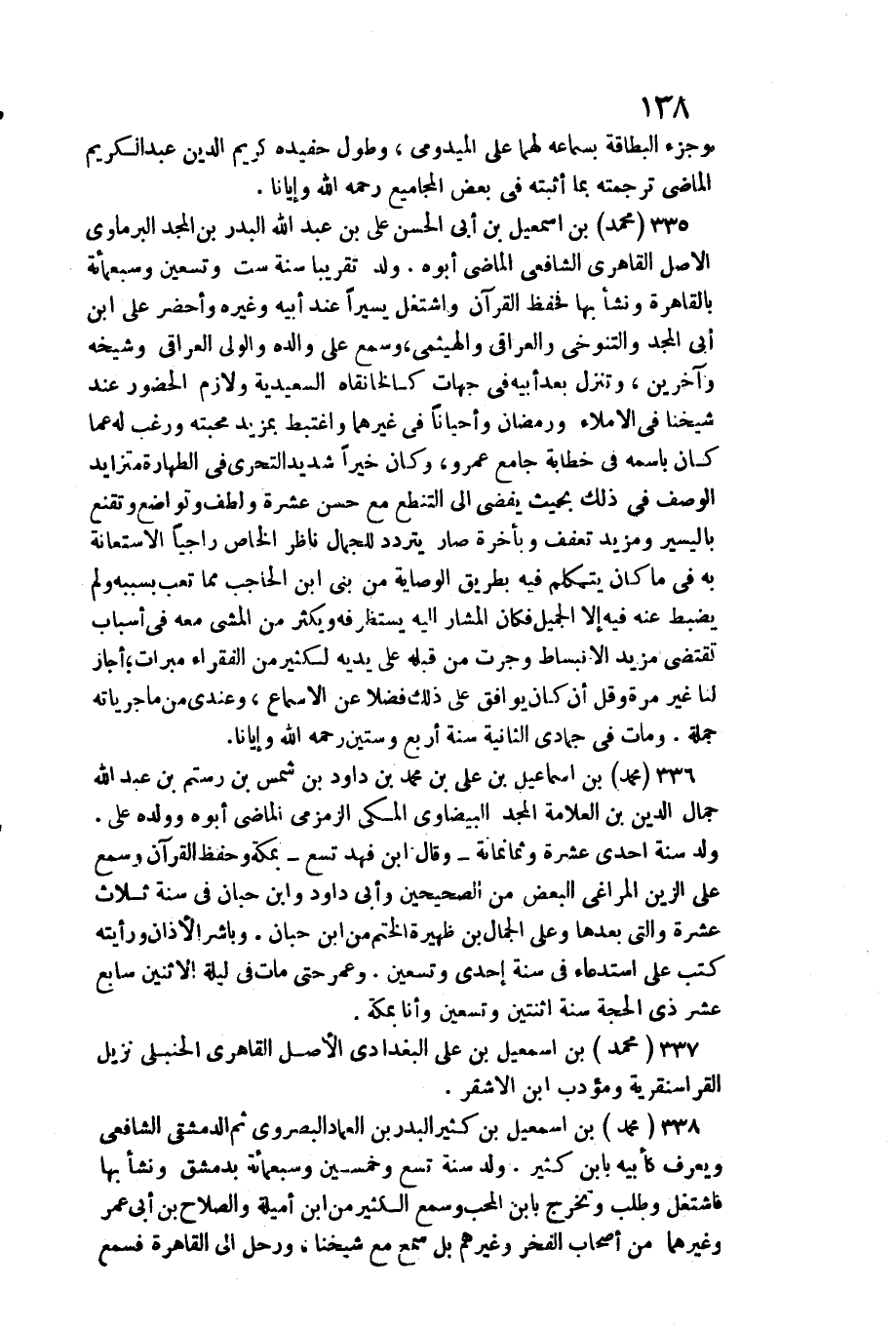 مُحَمَّد بن إِسْمَاعِيل بن كثير الْبَدْر بن الْعِمَاد البصروي ثمَّ الدِّمَشْقِي الشَّافِعِي وَيعرف كأبيه بِابْن كثير ولد سنة تسع وَخمسين وَسَبْعمائة بِدِمَشْق وَنَشَأ بهَا فاشتغل وَطلب وَتخرج بِابْن الْمُحب وَسمع الْكثير من ابْن أميلة وَالصَّلَاح بن أبي عمر وَغَيرهمَا من أَصْحَاب الْفَخر وَغَيرهم بل سمع مَعَ شَيخنَا، ورحل إِلَى الْقَاهِرَة فَسمع