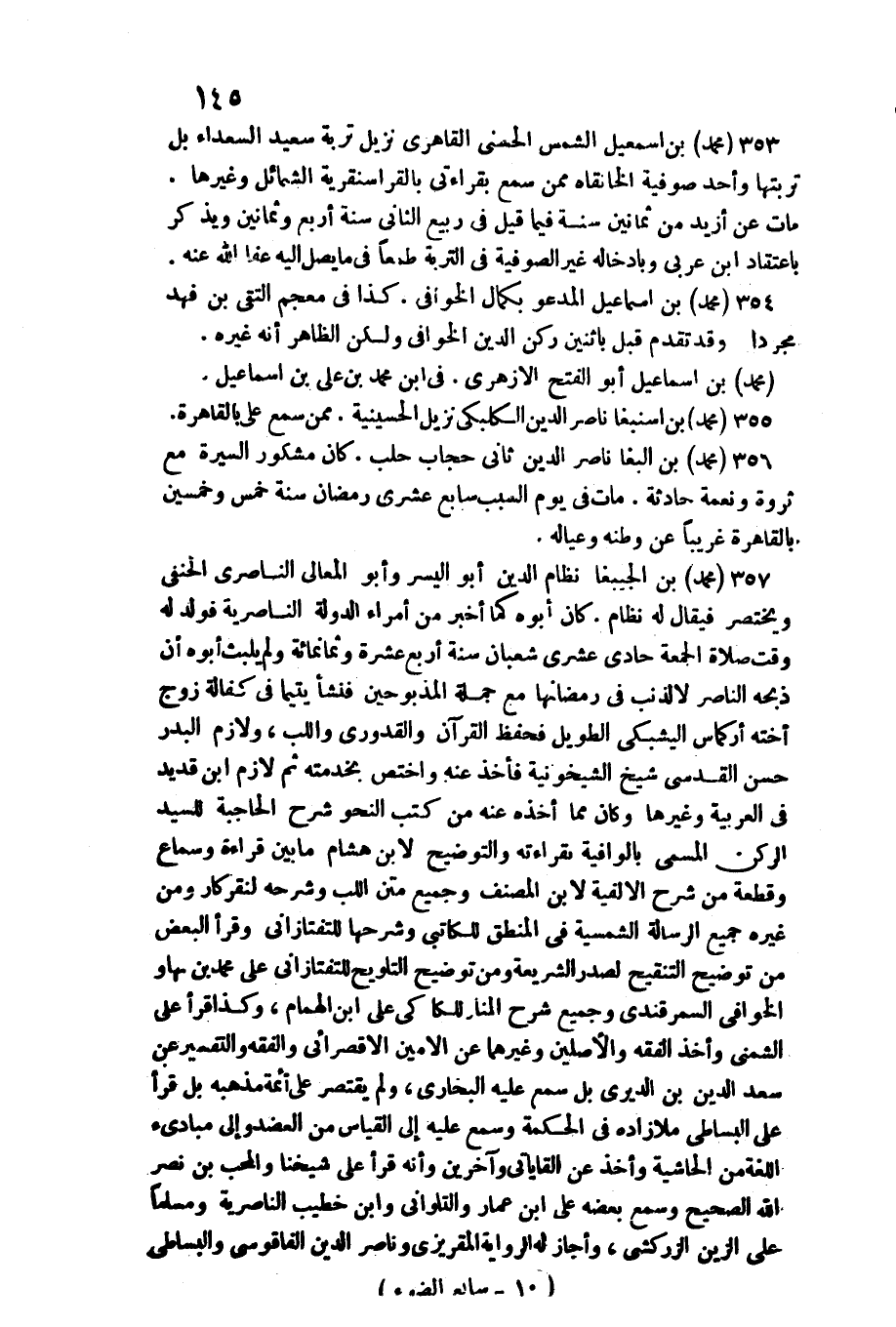مَعَ جملَة المذبوحين فَنَشَأَ يَتِيما فِي كَفَالَة زوج أُخْته أركماس اليشبكي الطَّوِيل فحفظ الْقُرْآن والقدوري واللب، ولازم الْبَدْر حسن الْقُدسِي سيخ السيخونية فَأخذ عَنهُ واختص بخدمته ثمَّ لَازم ابْن قديد فِي الْعَرَبيَّة وَغَيرهَا وَكَانَ مِمَّا أَخذه عَنهُ من كتب النَّحْو شرح الحاجبة للسَّيِّد الرُّكْن الْمُسَمّى بالوافية بقرَاءَته والتوضيح لِابْنِ هِشَام مَا بَين قِرَاءَة وَسَمَاع وَقطعَة من شرح الألفية لِابْنِ المُصَنّف وَجَمِيع متن اللب وَشَرحه لنقركار وَمن غَيره جَمِيع الرسَالَة الشمسية فِي الْمنطق للكاتبي وَشَرحهَا للتفتازاني وَقَرَأَ الْبَعْض من توضيح التَّنْقِيح لصدر الشَّرِيعَة وَمن توضيح التَّلْوِيح للتفتازاني عَليّ مُحَمَّد بن بهاو الخوافي السَّمرقَنْدِي وَجَمِيع شرح المنارللكاكي عَليّ ابْن الْهمام، وَكَذَا قَرَأَ على الشمني وَأخذ الْفِقْه والأصلين وَغَيرهمَا عَن الْأمين الأقصرائي وَالْفِقْه وَالتَّفْسِير عَن سعد الدّين بن الديري بل سمع عَلَيْهِ البُخَارِيّ، وَلم يقْتَصر على أَئِمَّة مذْهبه بل قَرَأَ على الْبِسَاطِيّ ملازاده فِي الْحِكْمَة وَسمع عَلَيْهِ إِلَى الْقيَاس من الْعَضُد وَإِلَى مبادئ اللُّغَة من الْحَاشِيَة وَأخذ عَن القاياتي وَآخَرين وَأَنه قَرَأَ على شَيخنَا والمحب بن نصر الله الصَّحِيح وَسمع بعضه على ابْن عمار والتلواني وَابْن خطيب الناصرية وَمُسلمًا عَليّ الزين الزَّرْكَشِيّ، وَأَجَازَ لَهُ الرِّوَايَة المقريزي وناصر الدّين الفاقوسي والبساطي